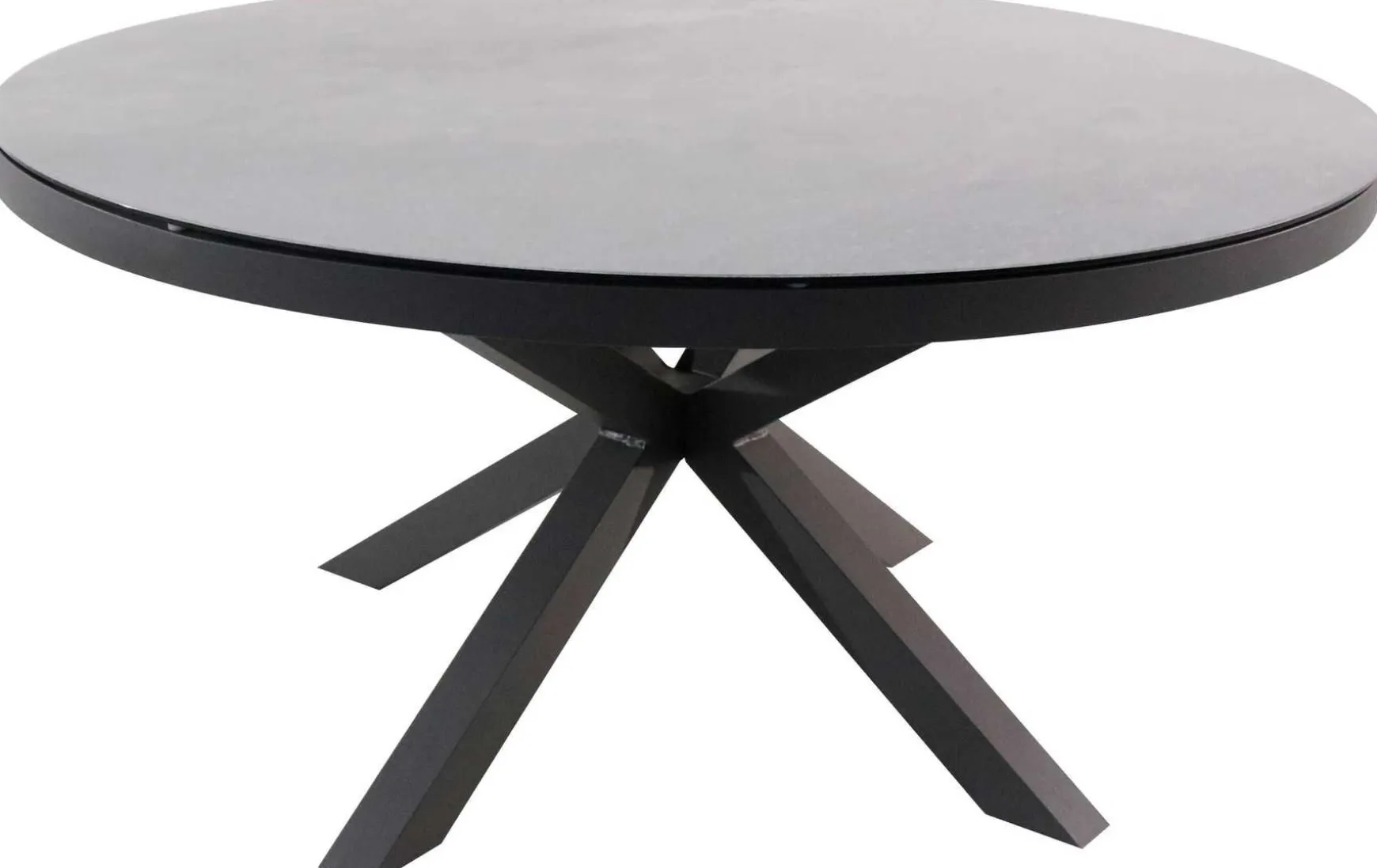 Der runde Gartentisch (Ø150 x H 74 cm) überzeugt mit einer grauen 3D-Glas-Tischplatte und einem robusten, anthrazitfarbenen Aluminiumgestell für modernes Outdoor-Design.