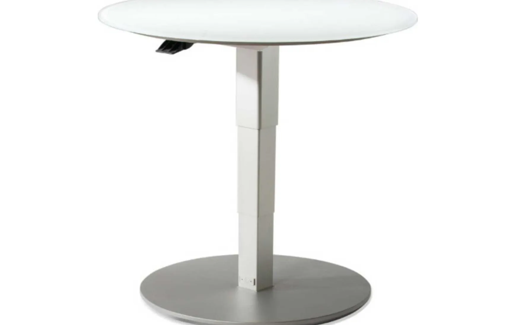 Dieser moderne Couchtisch ist ein Button-Tele-Lift Beistelltisch, der sich mit einem Taster unter der Tischplatte sehr leicht höhenverstellen lässt. Die Tele-Funktion erleichtert das Rausfahren der Säule wie das Fernrohr bei einem Teleskop. Somit erhöhen Sie den runden, weißen Couchtisch mit Glas Tischplatte von ca. 38,5 cm Höhe bis ca. 76 cm Tischhöhe. Kleine Rollen unter der Bodenplatte des runden Beistelltisches mit weißer Tischplatte bieten maximale Flexibiltät. Die runde weiß matt lackierte Glas-Tischplatte des Couchtisches und die perlsilberfarbig lackierte Bodenplatte mit Schliffoptik sowie stabile Säule verschaffen dem Beistelltisch eine schöne und elegante Optik.