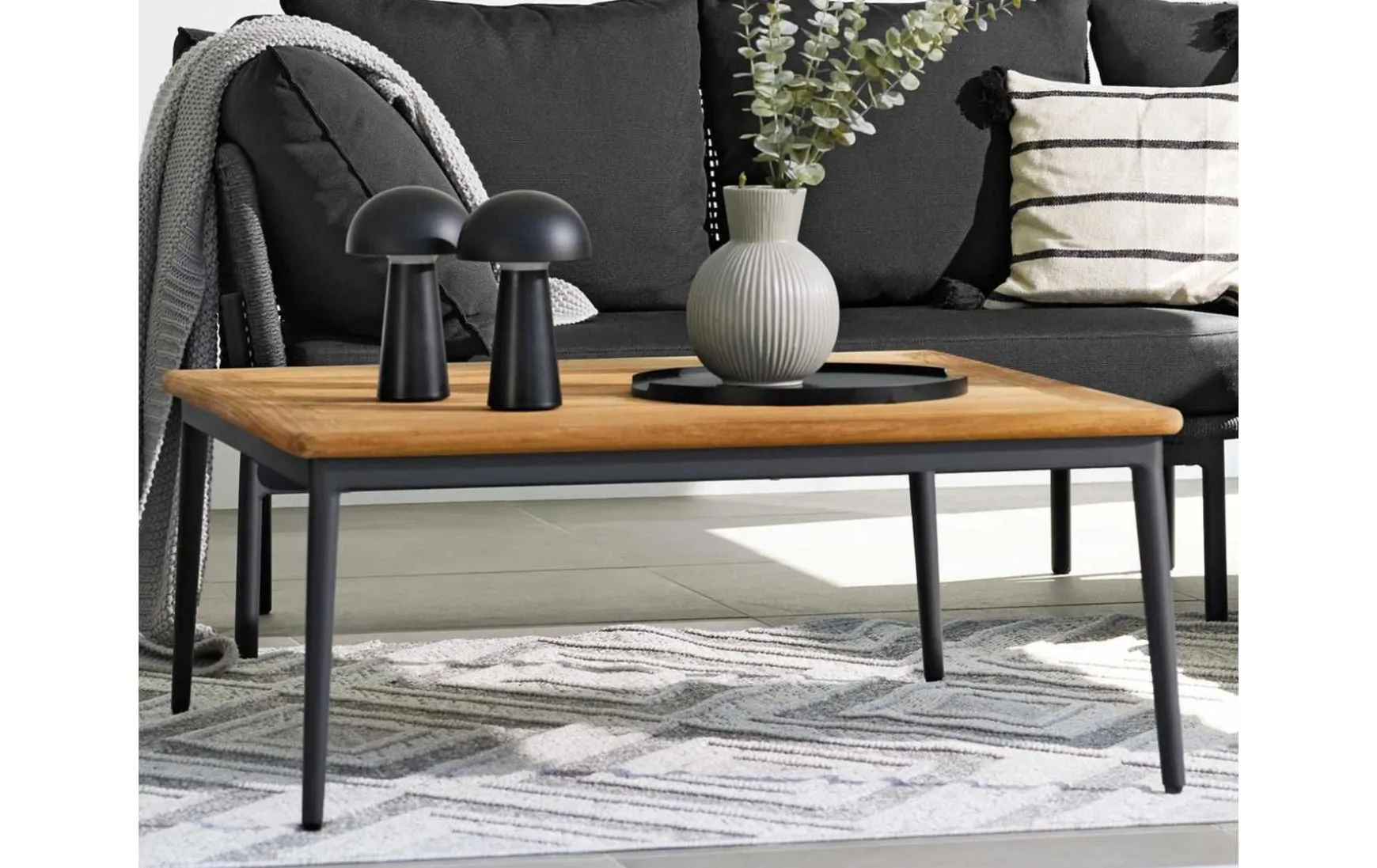 Dieser moderne Lounge-Tisch ist die perfekte Ergänzung für Ihre Outdoor-Lounge. Die quadratische Tischplatte aus hochwertigem Teakholz verleiht dem Tisch eine natürliche, elegante Ausstrahlung und setzt stilvolle Akzente auf Terrasse oder Balkon. Das stabile Gestell aus pulverbeschichtetem Aluminium sorgt für Langlebigkeit, Wetterbeständigkeit und eine moderne Optik, die das warme Teakholz optimal ergänzt. Durch die Kombination aus natürlichen und robusten Materialien wird dieser Lounge-Tisch zu einem langlebigen und funktionalen Highlight Ihres Outdoor-Bereichs.