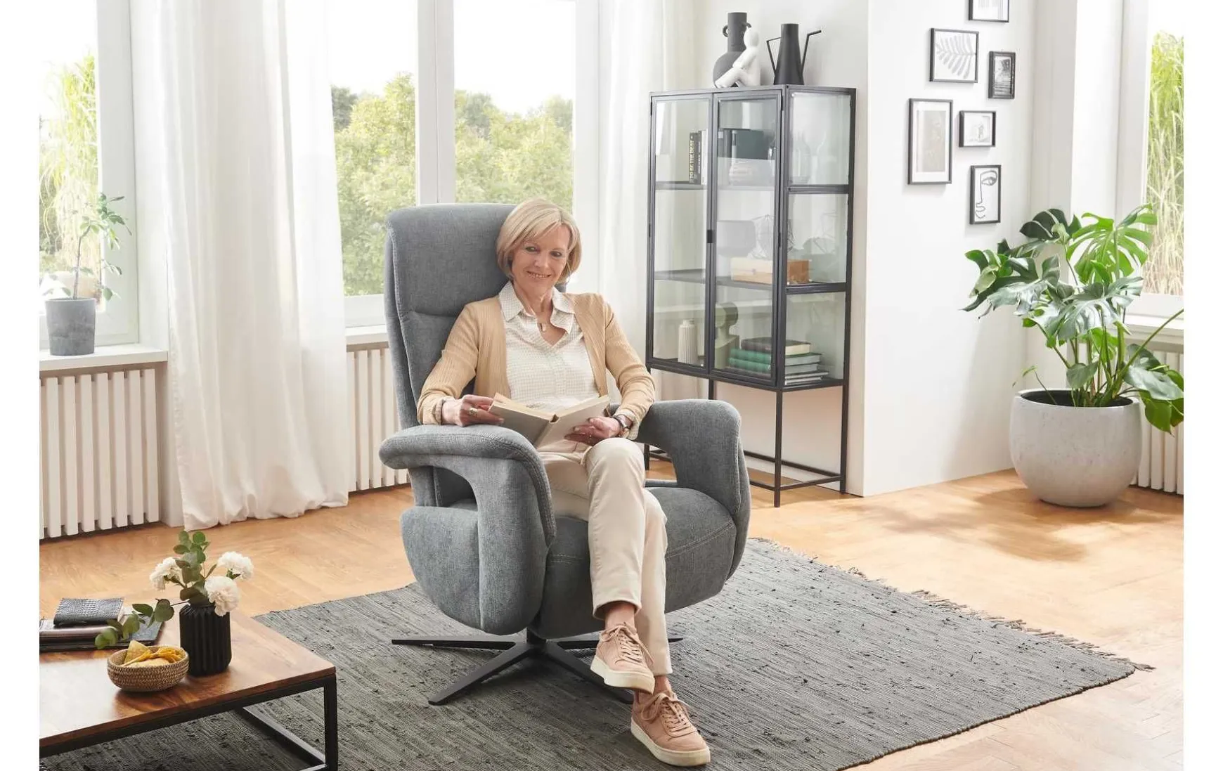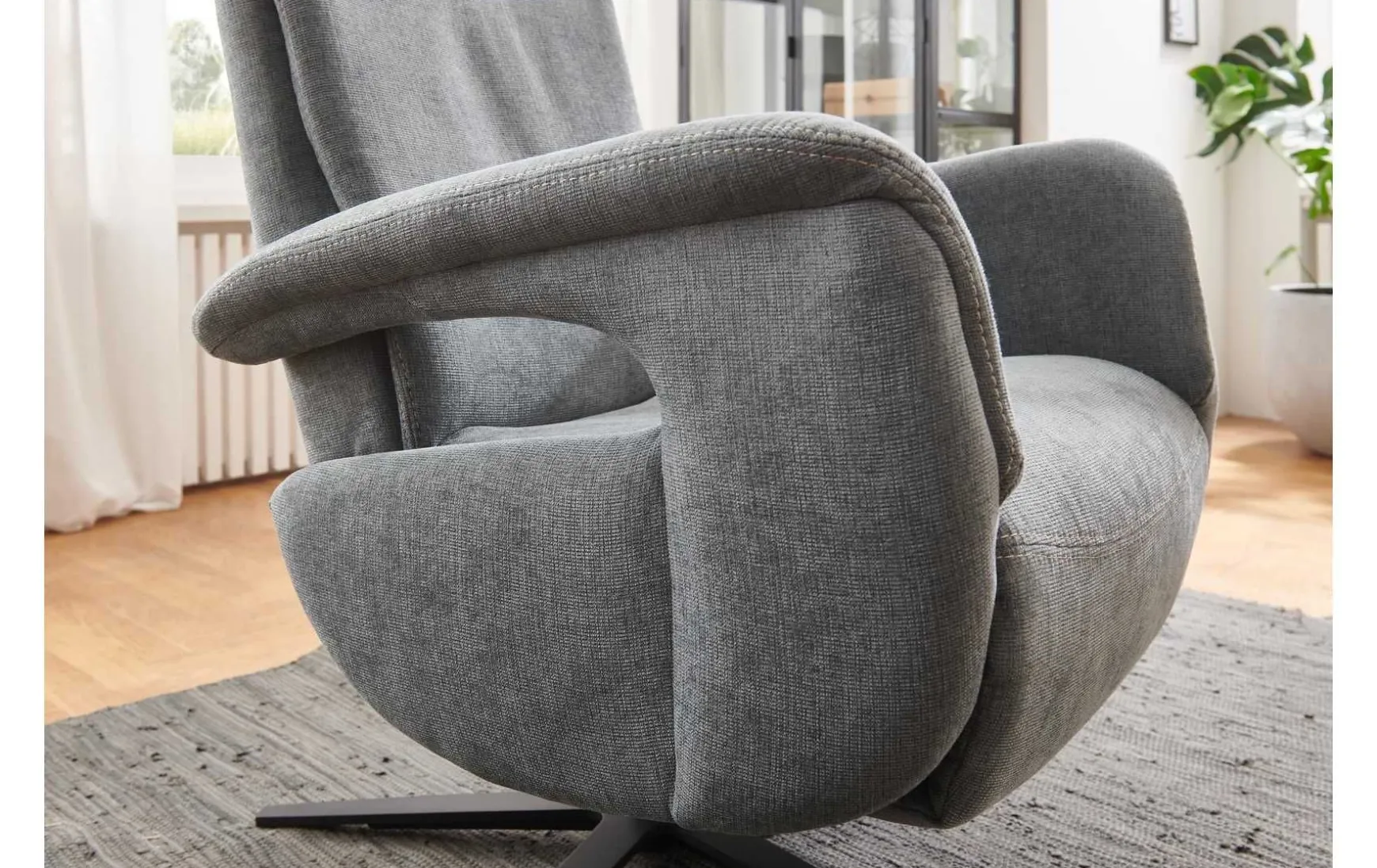 Stahlfarbener melierter Stoffezug mit Kontrast-Doppelsteppnaht mattschwarzer Aluminium-Sternfuß V1S hochwertige Polyätherschaumpolsterung auf Wellenunterfederung Rückenlehne mit hochwertiger Polyätherschaumpolsterung manuelle Relaxfunktionen Kopfpolster mehrfach mit Rasterbeschlag in der Neigung verstellbar leichter Körperdruck senkt die Rückenlehne, der Sitz geht automatisch nach vorn und oben die Beinauflage fährt bis zur Relaxposition nach oben 360 Grad drehbar belastbar bis maximal 110 kg Maße ca. 71 x 112 x 83 cm