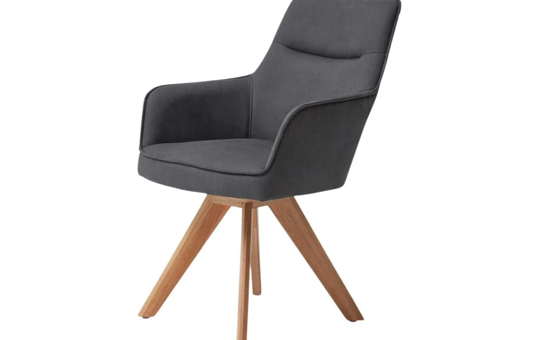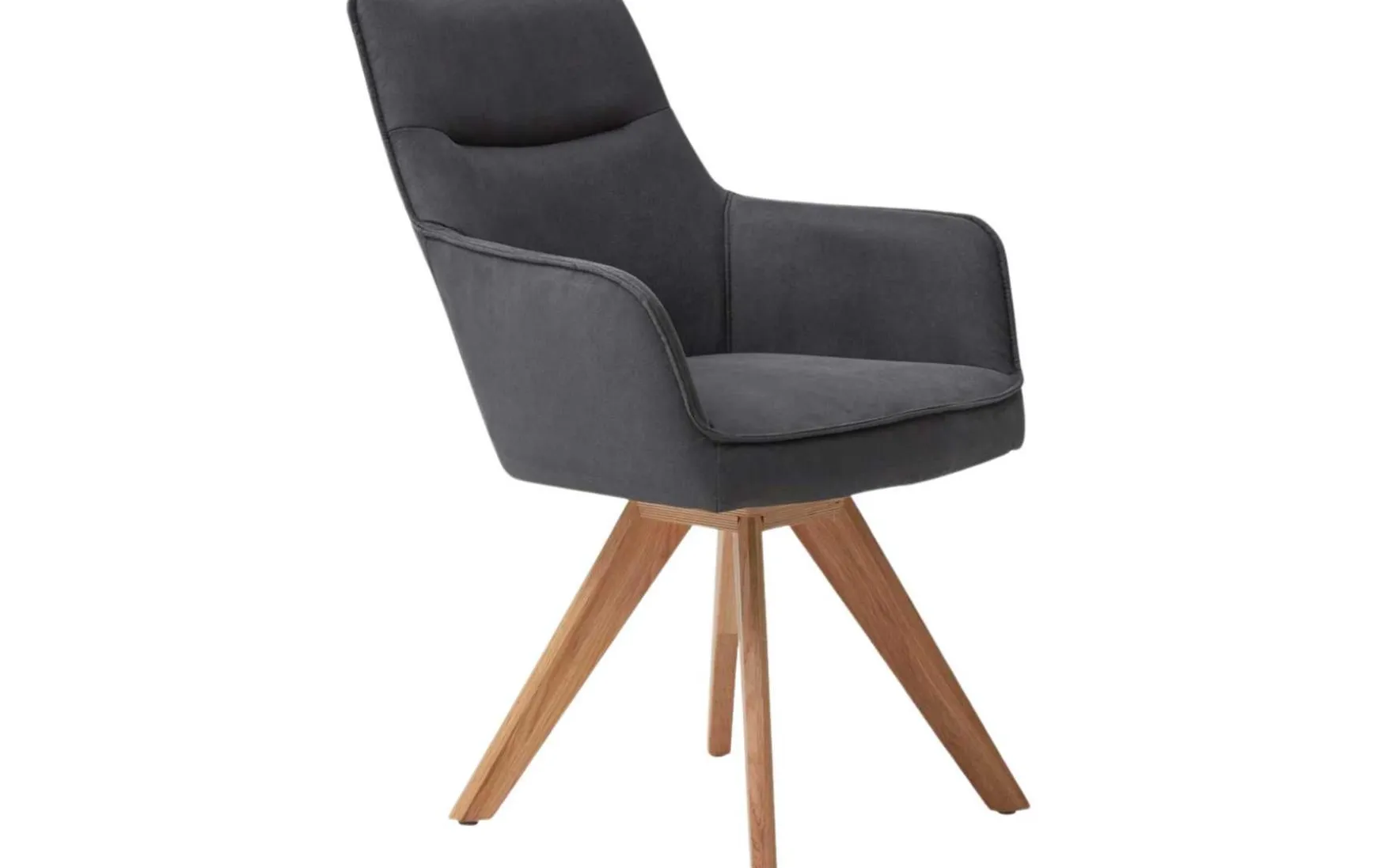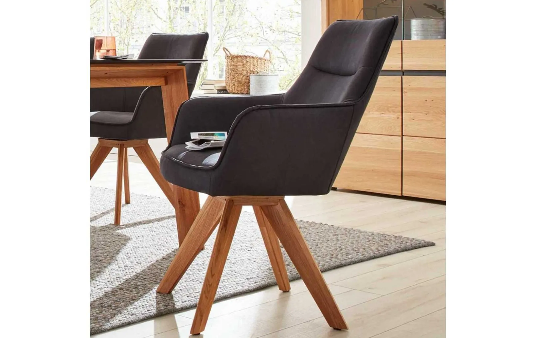 Dieser moderne Schalensessel bringt natürliches und warmes Flair in den Raum. Dafür zeichnet das Stativgestell mit den vier massiven geölten Wildeichefüßen verantwortlich. Perfekt darauf abgestimmt ist der klassisch-anthrazitfarbene Mikrofaserbezug. Durch die puristische Farbgebung und das exzellente Material verleiht er dem Esszimmersessel eine elegante Ausstrahlung mit dem gewissen Etwas. Ein weiteres optisches Highlight bildet der markante Quereinzug im Rücken. Funktional begeistert neben der herausragenden Verarbeitungsqualität und Robustheit vor allem der hohe Sitzkomfort des Schalenstuhls. Er ist mit bequemen Armlehnen ausgestattet, deren Höhe ca. 65 cm beträgt. Darüber hinaus sorgt die Haptik der Mikrofaser zusammen mit der angenehmen Polsterung für die gewünschte Gemütlichkeit beim Essen und Zusammensitzen mit Familie und Freunden. Zudem bietet der um 180 Grad drehbare Armlehnstuhl eine praktische Rückholfunktion. Die Maße des attraktiven Schalensessels belaufen sich auf ca. 61 x 89 x 64 cm (BxHxT); der Sitz ist ca. 48 cm hoch, ca. 47 cm breit und ca. 43 cm tief. Alternativ steht der rundum überzeugende Polsterstuhl mit einer anderen Gestellvariante und/oder ohne Rückholfunktion zur Wahl.