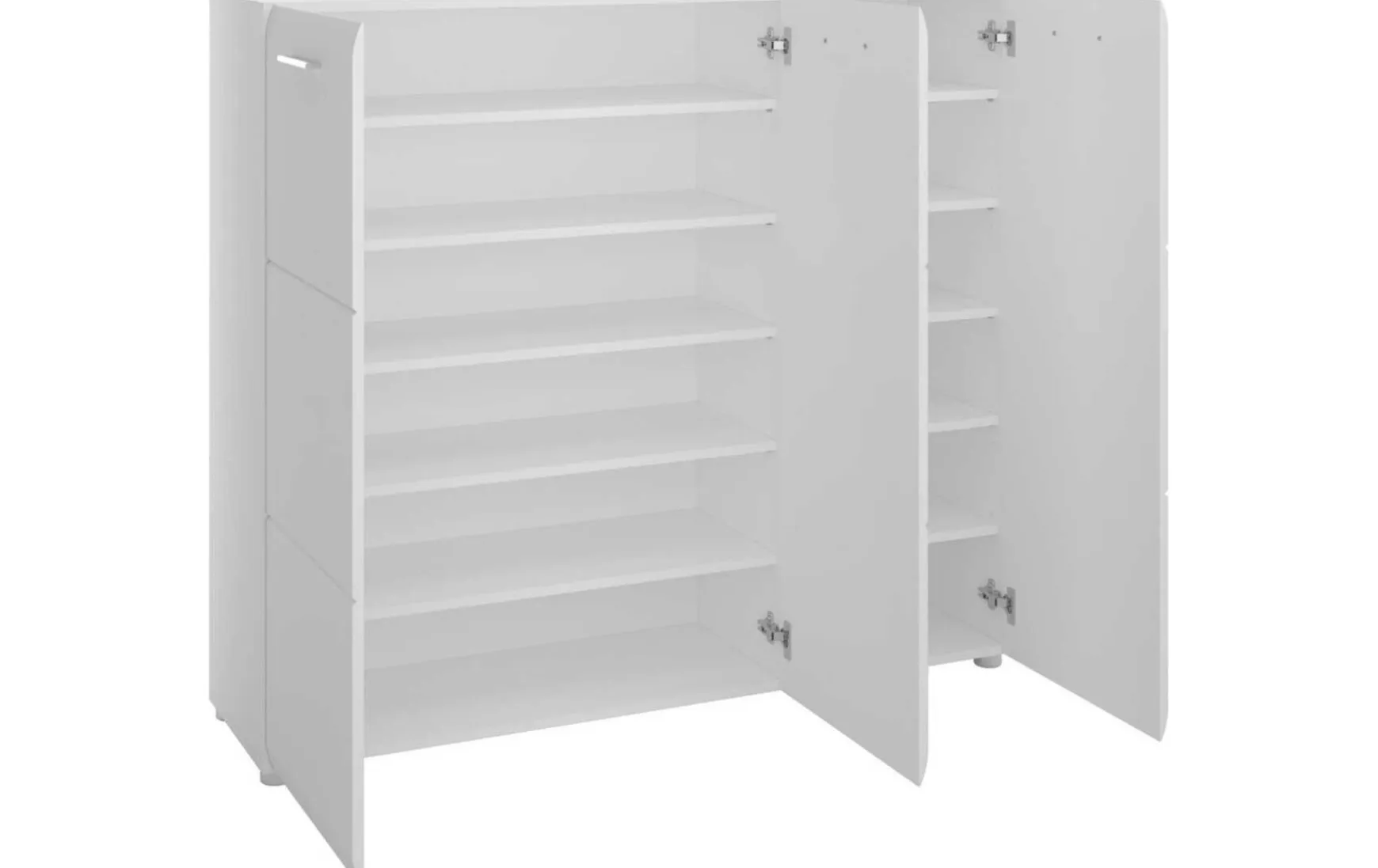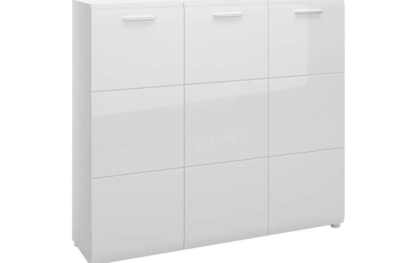 Der Schrank ist in einem angesagten weiß hochglanz gehalten und verleiht Ihrer Diele einen besonderen Charme. Die silberfarbenen Griffe vervollständigen das Erscheinungsbild und bestärken den stilvollen Look. Durch die gewählte Farbgebung fügt sich dieser elegante Klassiker in viele Einrichtungsideen nahtlos ein. Auf einer Breite von ca. 134 cm finden Sie genügend Stauraum zur Aufbewahrung Ihrer Stiefel und Boots. Durch das Öffnen der 3 Drehtüren erhalten Sie den idealen Blick über Ihre Schuhsammlung und können im Handumdrehen die passenden Schuhe heraussuchen. Für ein ordentliches Einräumen unterstützen Sie hierbei 10 Einlegeböden. Unser Schuhschrank bietet ebenso eine Ablagefläche, welche man als Bühne für Pflanzen, Fotos oder Deko Accessoires nutzen kann.