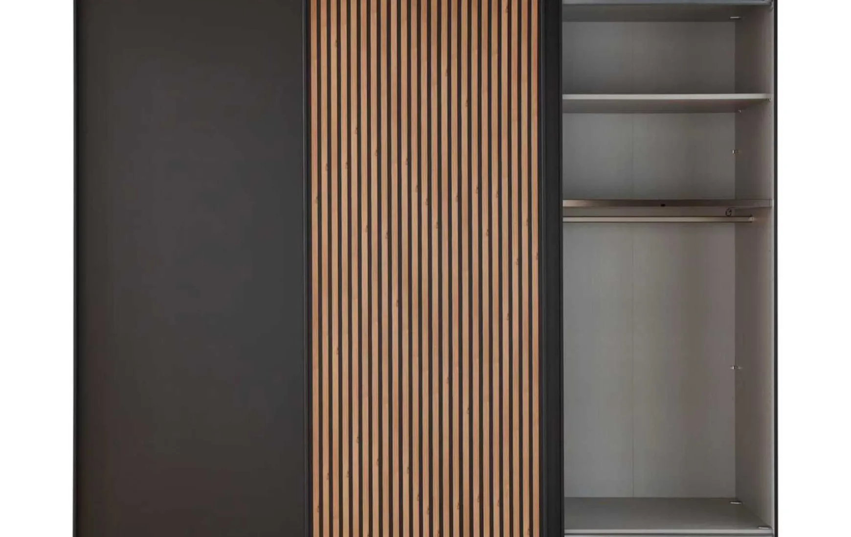 Mit diesem Schwebetürschrank bekommen Sie einen edlen Kleiderschrank mit Korpus und Front in Graphit-Dekor, dabei ist 1 Tür vom Kleiderschrank in Bianco-Eiche-Nachbildung mit interessanten Lamellen enthalten. Die Griffleisten von diesem Schlafzimmerschrank sind richtig passend zum Schrank, und zwar in Graphit-Dekor.