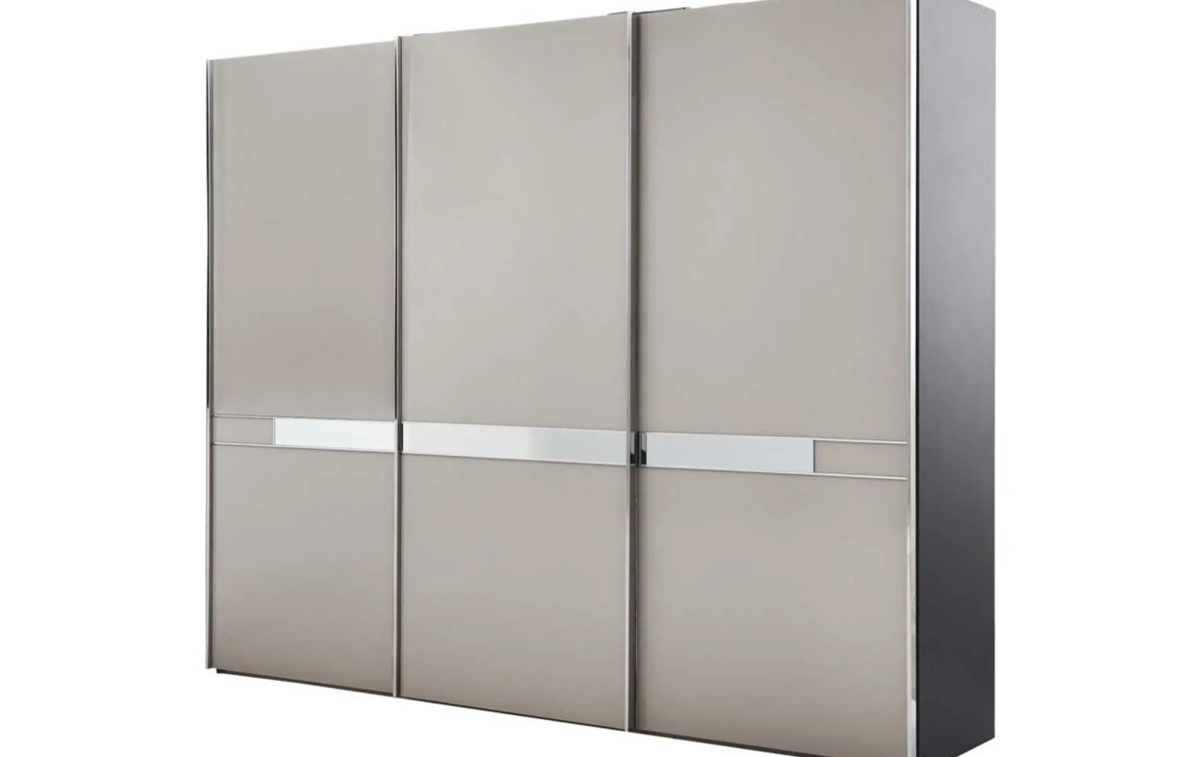 Dieser Schwebetürenschrank kombiniert einen graphitfarbenen Korpus mit kieselgrauen Glasfronten, die wiederum ein Kristallspiegel-Querriegel akzentuiert. Chromfarbene Griff- und Zierleisten runden das modern-elegante Design des Schlafzimmerschranks harmonisch ab. Die treelinefarbene Innenausstattung verleiht dem Kleiderschrank eine natürliche Note. Mit Maßen von ca. 300 x 217 x 67 cm (BxHxT) bietet der Schwebetürenschrank jede Menge Stauraum für Kleidung und andere Textilien. Dank der sechs Einlegeböden und der drei Kleiderstangen können Sie Ihre Kleidungsstücke liegend und hängend aufbewahren. Optional ist der Kleiderschrank mit einer Türdämpfung ergänzbar. Diese gewährleistet ein betont sanftes und leises Öffnen und Schließen.