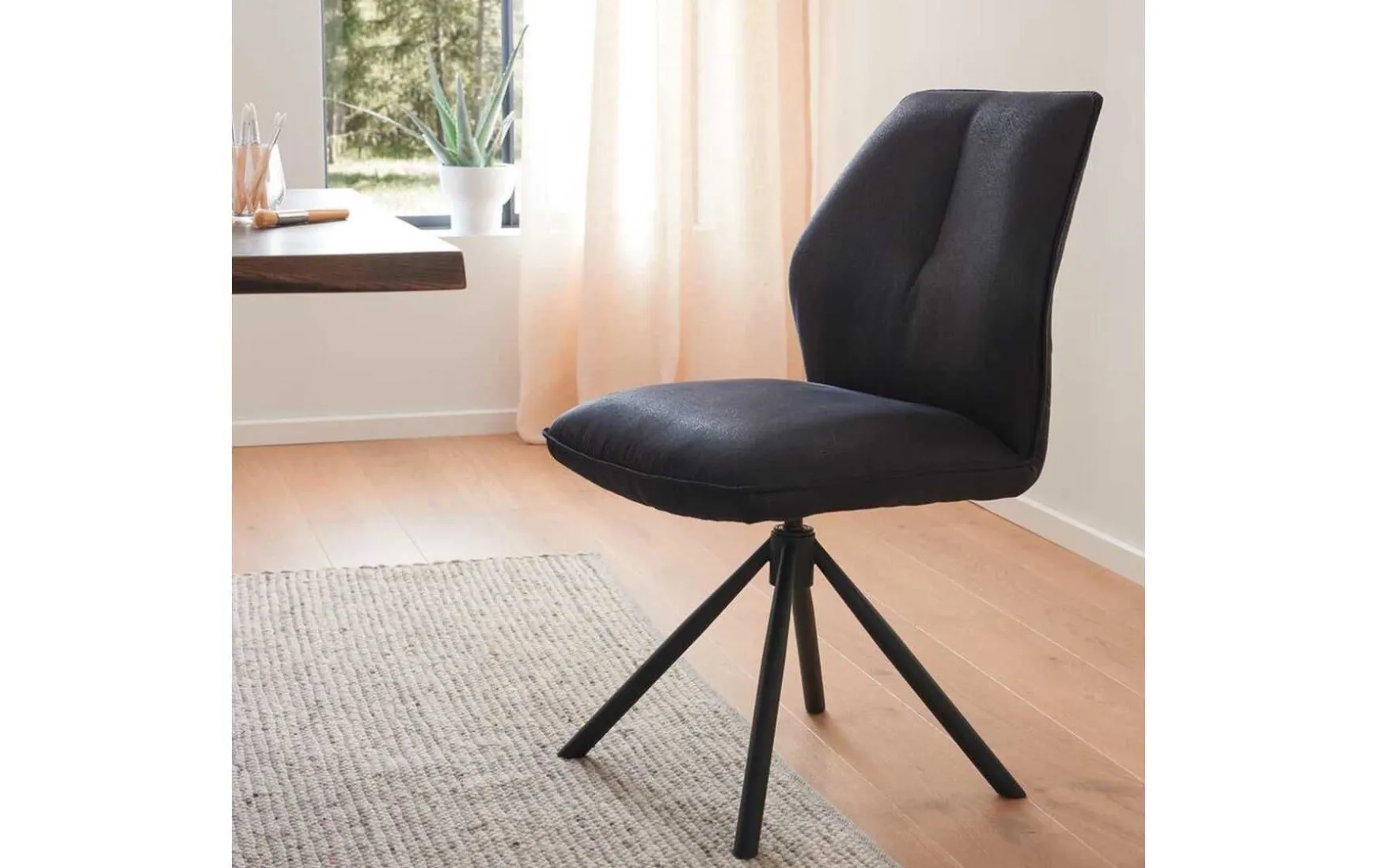 Dieser Stuhl bietet mit seiner Breite von 52 cm, einer Höhe von 90 cm und einer Tiefe von 63 cm einen hervorragenden Sitzkomfort, unterstützt durch eine hochwertige Taschenfederkernpolsterung. Der Bezug aus Mikrofaser in Night Schwarz verleiht dem Stuhl eine elegante und zugleich robuste Oberfläche, ideal für den täglichen Gebrauch. Das Gestell aus schwarz gepulvertem Metall sorgt für Stabilität und fügt sich nahtlos in das moderne Design ein.