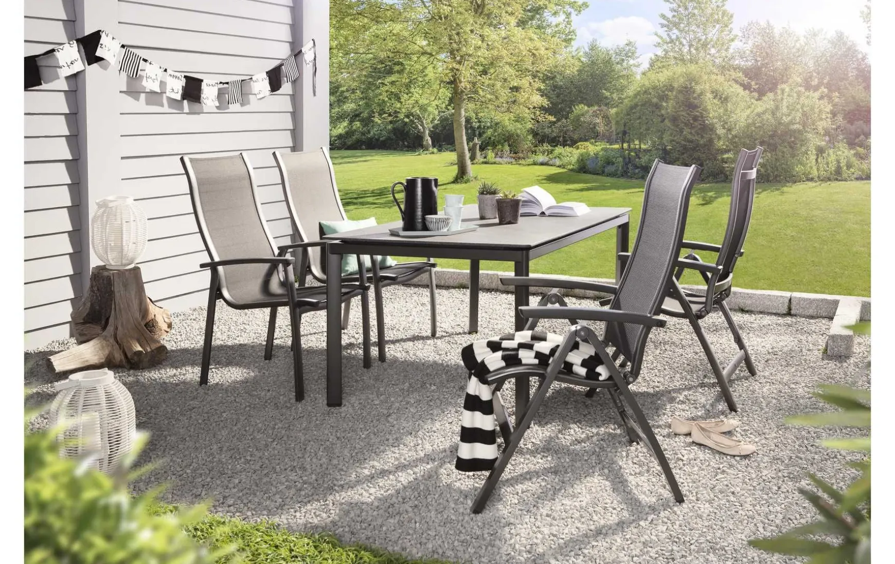 Egal ob sommerliche Kaffeerunde, zünftiger Grillabend oder einfach nur auf ein Glas und ein gutes Gespräch – dieser Gartentisch wird schnell zum gemütlichen Mittelpunkt auf Ihrer Terrasse oder im Garten. Mit seiner Größe von 160 x 95 cm bietet er bequem Platz für 6 Personen, ohne selbst zu viel Raum einzunehmen. Sein Design ist zeitlos schlicht und lässt sich, unterstützt von der dezenten Farbgebung in Eisengrau/Schwarz genauso gut zu modernen Stahlrohr-Möbeln kombinieren wie auch als bewusster Kontrast zu Echtholzmöbeln.