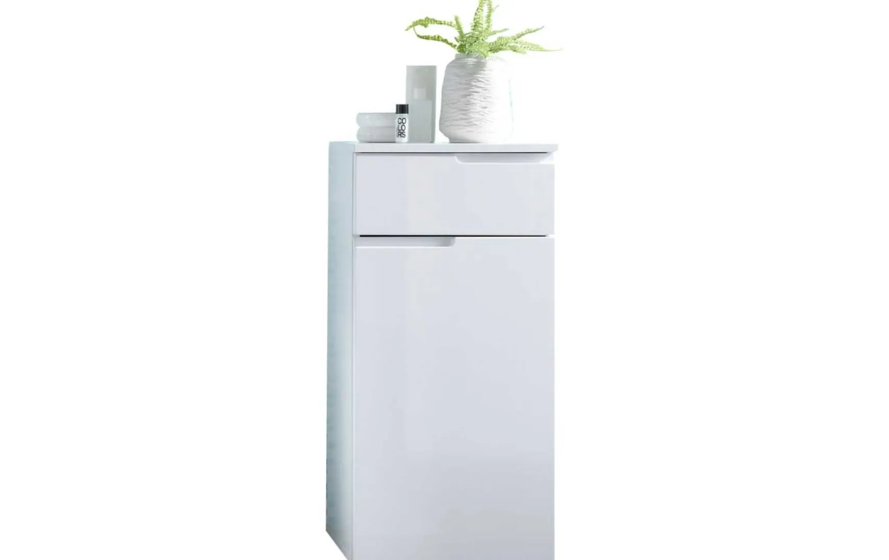 Der moderne Unterschrank in Weiß überzeugt durch sein minimalistisches Design und flexible Montagemöglichkeiten, da er sowohl freistehend als auch hängend eingesetzt werden kann. Ausgestattet mit einer Tür und einer Schublade bietet der Schrank praktischen Stauraum für Bad- oder Wohnaccessoires. Die grifflosen Fronten mit integrierter Griffmulde und die hochglänzende Oberfläche verleihen dem Möbelstück eine elegante, zeitgemäße Optik.