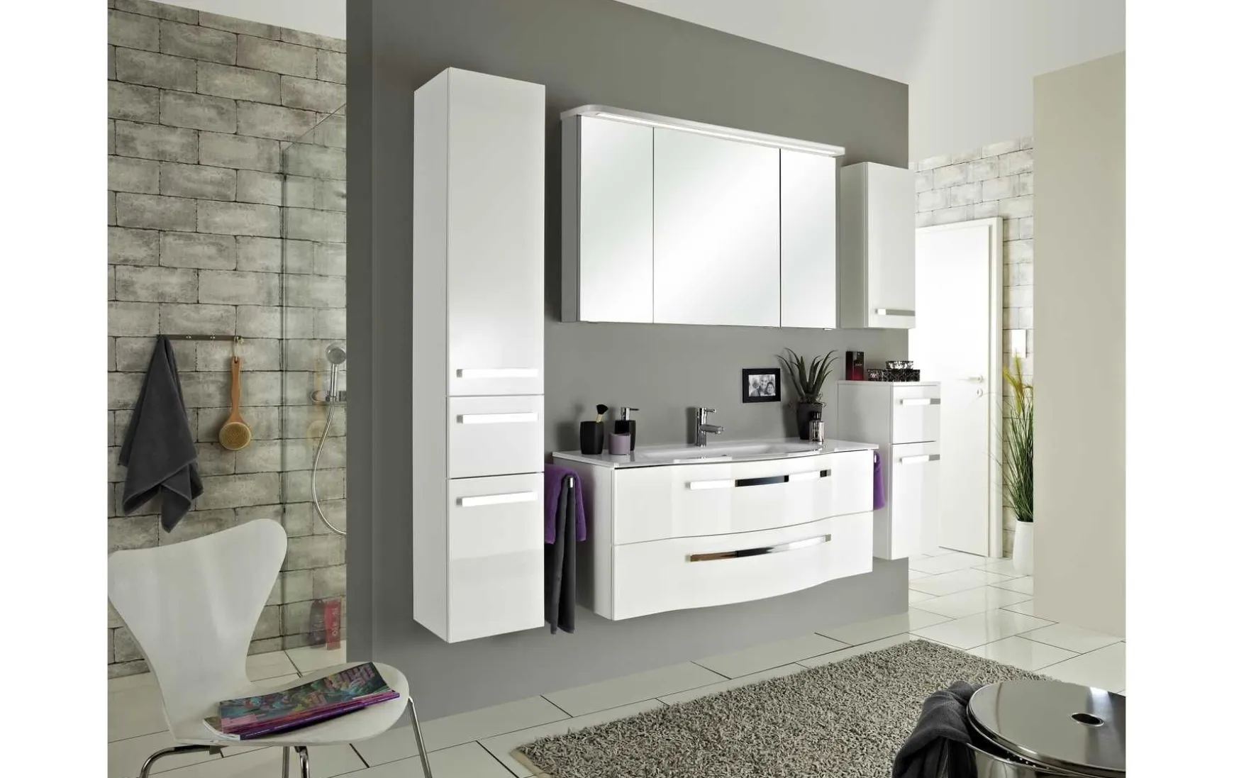 - Bestehend aus: 1x Spiegelschrank inkl. LED-Beleuchtung im Kranz mit 3 Spiegeltüren, 6 Glaseinlegeböden, Schalter/Steckdose, B/H/T: ca. 120/72.6/17 cm; 1x Waschtischunterschrank mit 2 Auszügen, B/H/T: ca. 115/48.2/48.1 cm; 1x Glaswaschtisch mit Armaturbohrung und integriertem Überlauf, Klarglas weiß lackiert, B/H/T: ca. 117/1.5/49.1 cm; 1x Hochschrank mit 2 Drehtüren, 1 Auszug, 3 Glaseinlegeböden, Anschlag beidseitig wechselbar B/H/T: ca. 30/168/33 cm; 1x Highboard mit 1 Auszug, 1 Drehtür, 1 Glaseinlegeboden, 1 Abdeckplatte, Anschlag beidseitig wechselbar, B/H/T: ca. 30/73/33 cm; 1x Wandschrank mit 1 Drehtür, 2 Glaseinlegeböden, Anschlag beidseitig wechselbar, B/H/T: ca. 30/70/17 cm