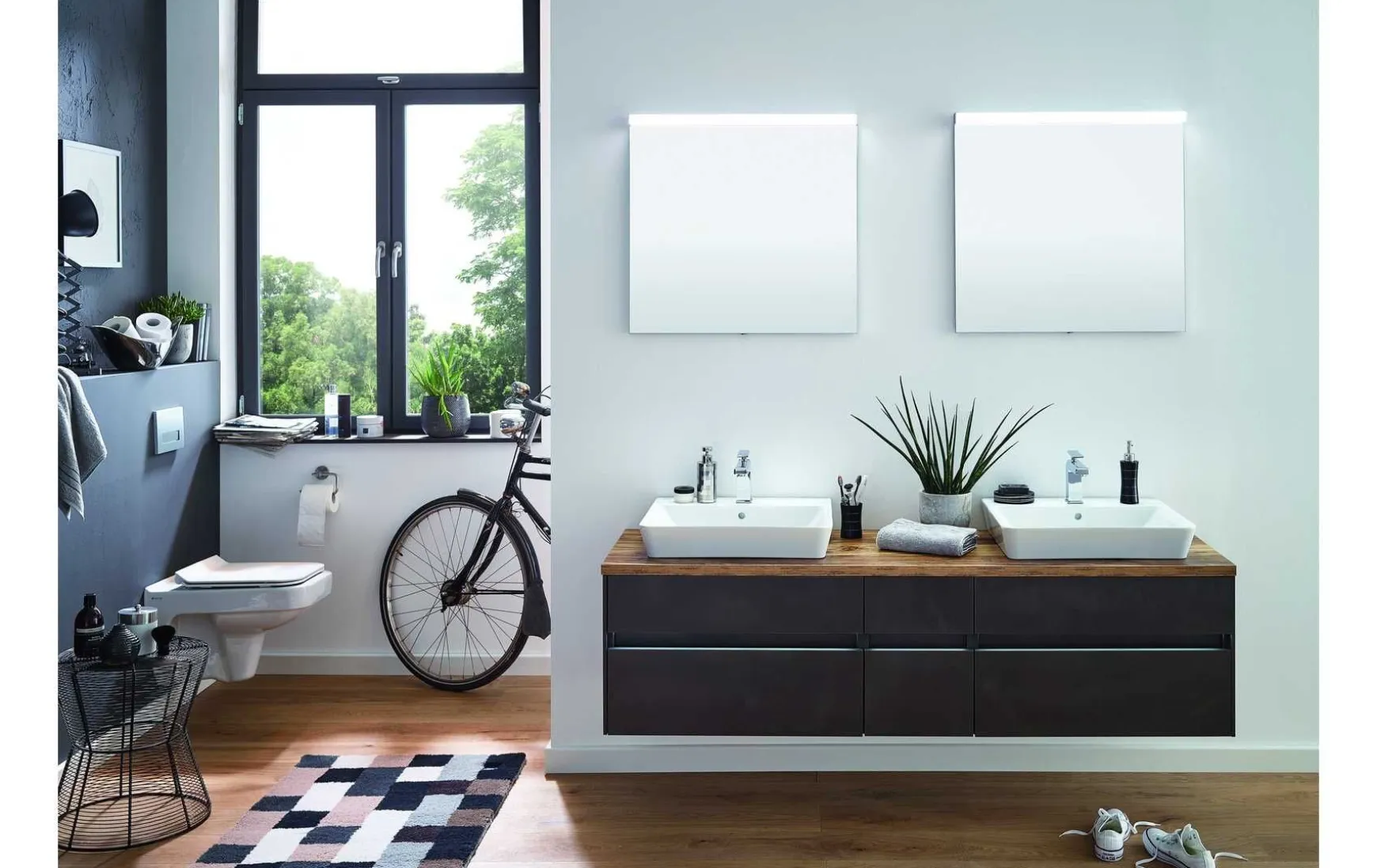 - Im Preis enthalten: 2x Flächenspiegel mit LED-Beleuchtung, 2x Keramikaufsatzbecken, 2x Waschtischunterschrank, 1x Unterschrank, 3x beleuchtete Griffprofile mit Bewegungssensor, 2x seitliche Aufdopplung, 1x Waschtischplatte