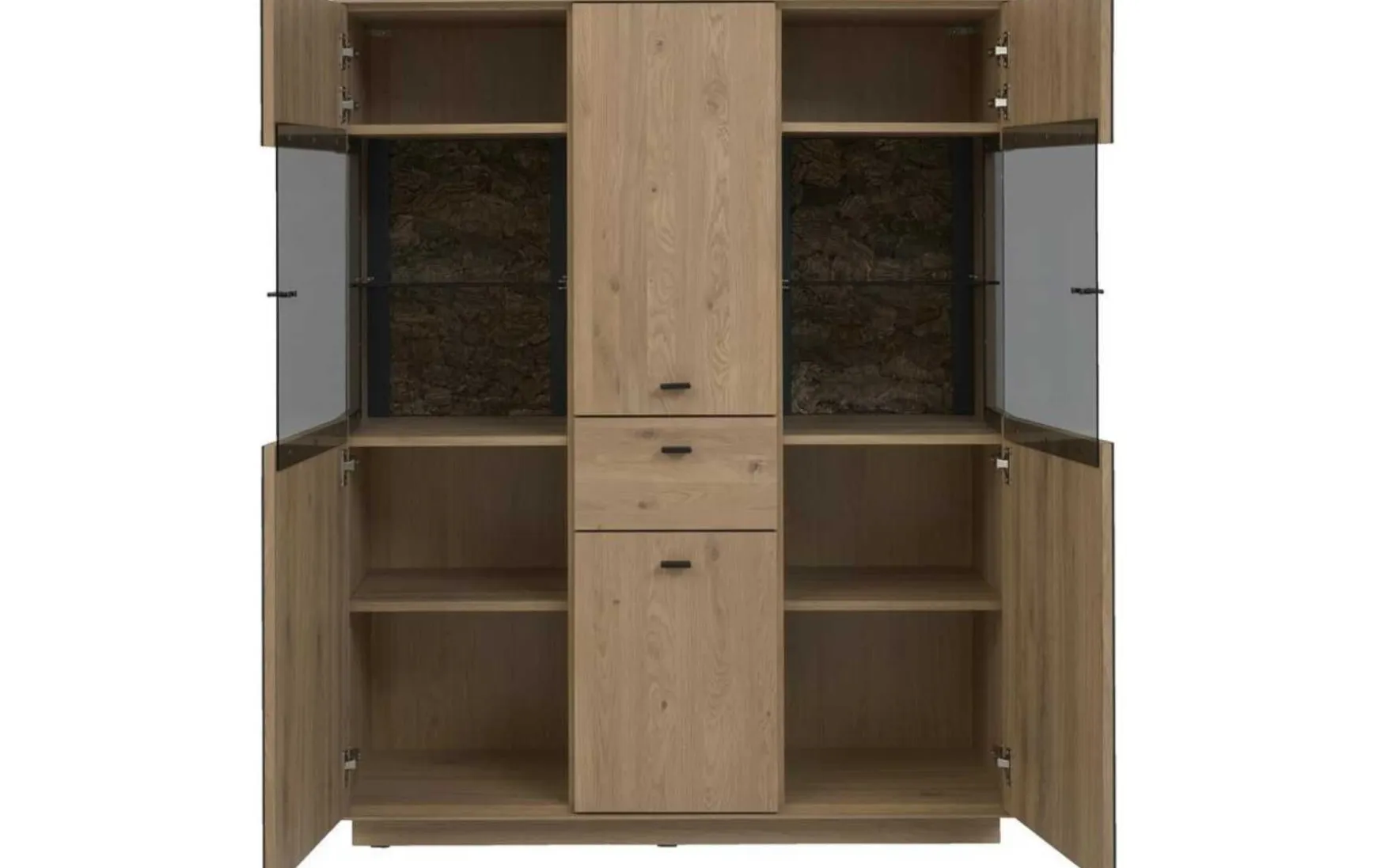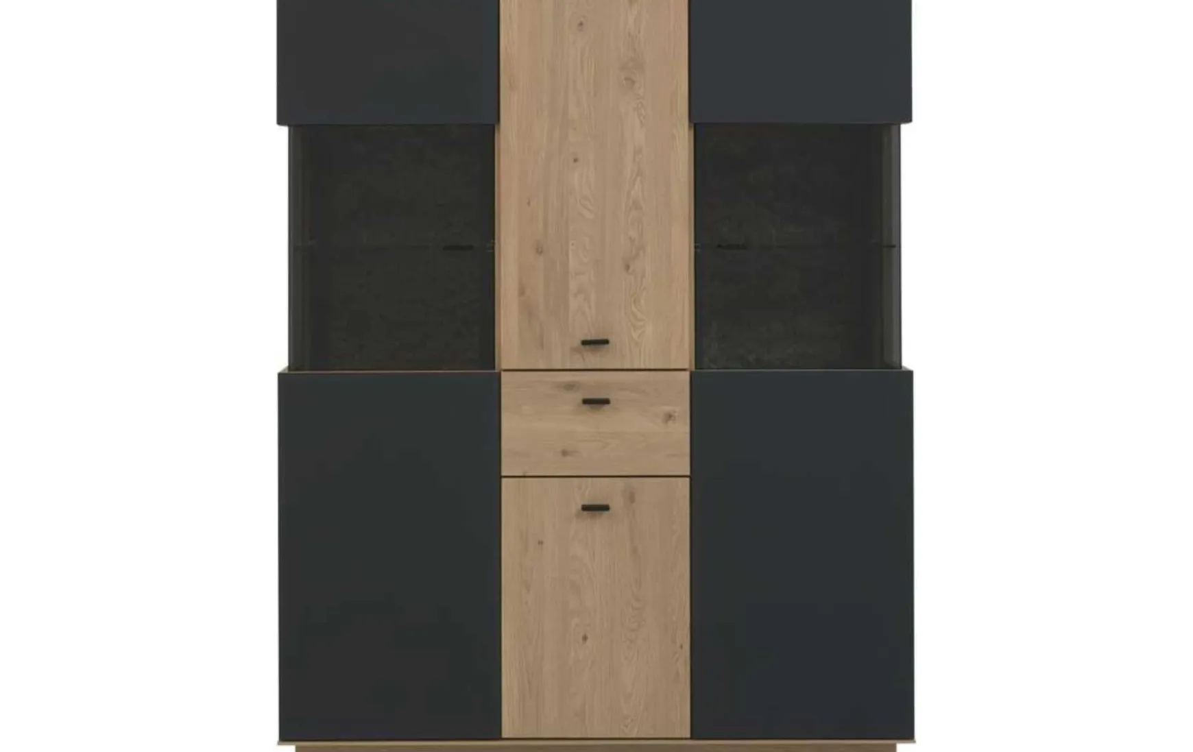 Dieses Highboard misst ca. 116x144x40 cm (BxHxT) und ist die perfekte Ergänzung für jeden modernen Wohnstil. Der Korpus ist in Wildeiche furniert und die Front aus massiver Wildeiche gefertigt, die in hervorragender Synergie mit den Glasfronten und -böden aus Parsolglas in Anthrazit stehen. Besondere Akzente setzen die Absetzungen aus Echt-Kork und mattiertem anthrazitfarbenem Glas. Das Sideboard kommt mit zwei Glas-/Holztüren, zwei weiteren Holztüren und einem Schubkasten, um all deine Bedürfnisse an Stauraum und Organisation zu erfüllen. Von Geschirr und Büchern bis hin zu Dekoartikeln und Multimedia, hier findet alles seinen festen Platz. Das Design wird durch die eleganten Metallgriffe in Anthrazit und den Sockel mit Nagelgleitern perfekt abgerundet. Bitte beachte, dass die LED-Beleuchtung nicht im Lieferumfang enthalten ist.