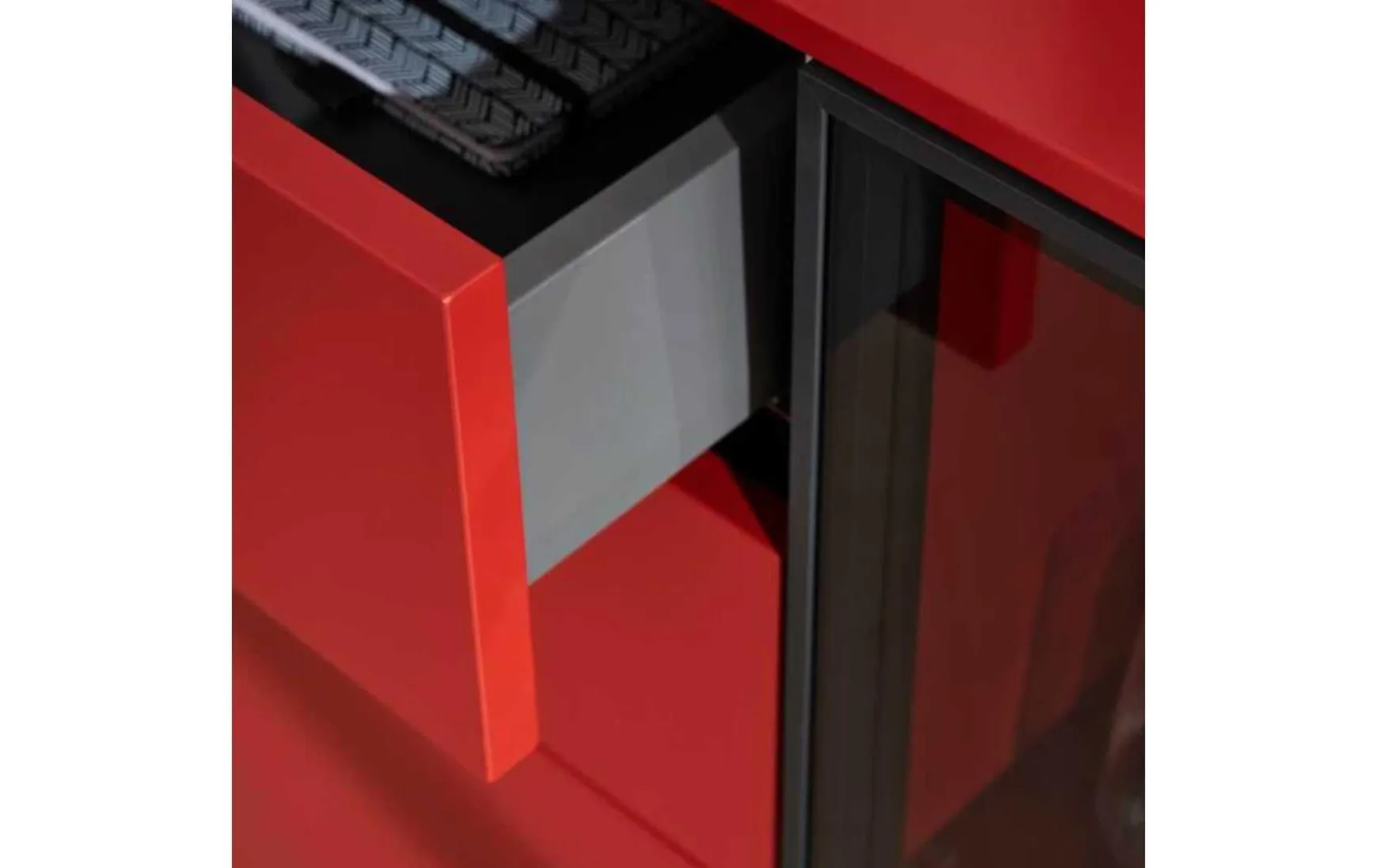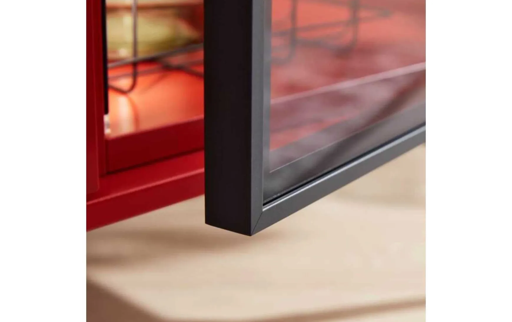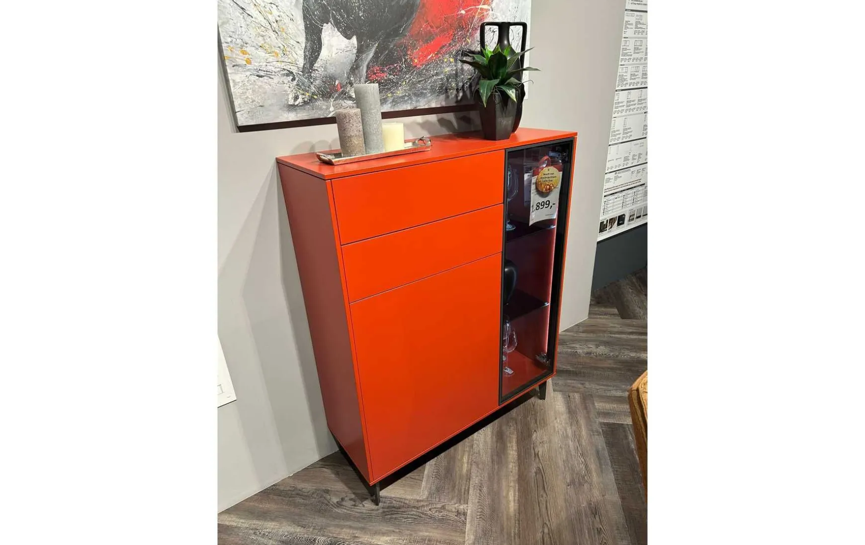 Das hochwertige Highboard fasziniert mit dem rubinroten Mattlackdesign. Puristisch schieferschwarz pulverbeschichtete Design-Metallfüße runden die moderne Hochkommode stilsicher ab. Für das gewisse Etwas sorgt der Parsolglaseinsatz mit schieferschwarzem Aluminiumrahmen. Der weiße Innenkorpus ist melaminbeschichtet und damit besonders widerstandsfähig und pflegeleicht. Eine optisch wie funktional begeisternde Eigenschaft der Kommode bilden die grifflosen Fronten mit Push-to-open-Funktion und Türdämpfung. Letztere ermöglicht lautloses Schließen. Den gleichen Vorteil haben die Schubladen: Sie sind mit einer Schließdämpfung ausgestattet. Des Weiteren bringen sie einen praktischen Selbsteinzug mit, der die Handhabung spürbar erleichtert. Die Maße des geräumigen Kommodenschranks belaufen sich auf ca. 98 x 121 x 37 cm (BxHxT). Er beherbergt je eine Holz- und Glastür mit insgesamt einem Holz- und zwei Glasböden sowie zwei flache Schubladen.