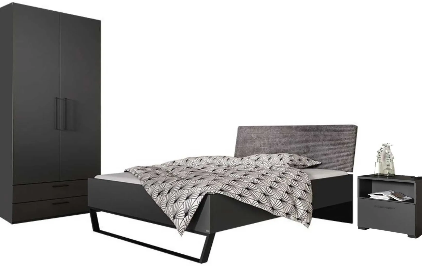 - Im Preis enthalten: Bett mit Metall-Kufen-Fuss und Cord-Polsterkopfteil, 2 türiger Kleiderschrank mit 4 Einlageböden, 1 Kleiderstange und 3 außenliegenden Schubkästen, Nachtkonsole mit 1 offenem Fach und 1 Schubkasten samt Steckdoseneinsatz, 1 Schuko und 1 USB 2.0