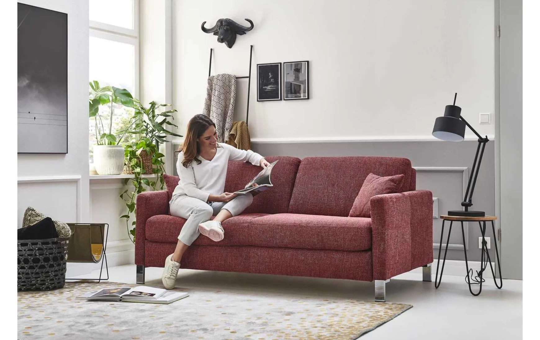 Formschön und kompakt passt das Schlafsofa in jedes Wohn- oder Schlafzimmer. Selbst wer auf eher engem Raum lebt, kann mit dem multifunktionalen Möbelstück bequem Platz sparen – ohne Verzicht auf ein Höchstmaß an optischer Raffinesse. Auch als moderne Ausstattung für den Gästebereich macht das vielseitige Funktionssofa eine gute Figur. Das Sofa kommt in einem gedeckten Rot und passt somit zu einer Vielzahl an Nuancen des Interieurs. Sein roter Webstoffbezug ist besonders weich im Griff. Für eine erstklassige Schlafqualität sorgt die darunterliegende ca. 11 cm starke Kaltschaummatratze auf stabilen Federholzleisten.
