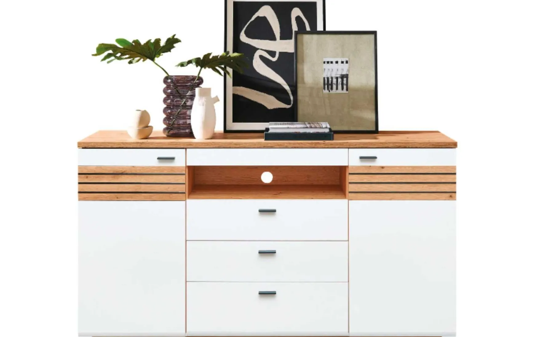 Modern und schlicht präsentiert sich dieses Sideboard in einem angesagten Mix aus Holz und Weiß. Es besticht durch seine schöne Oberfläche und dem großzügigen Stauraum hinter zwei Türen, in drei Schubladen und einem offenen Fach.