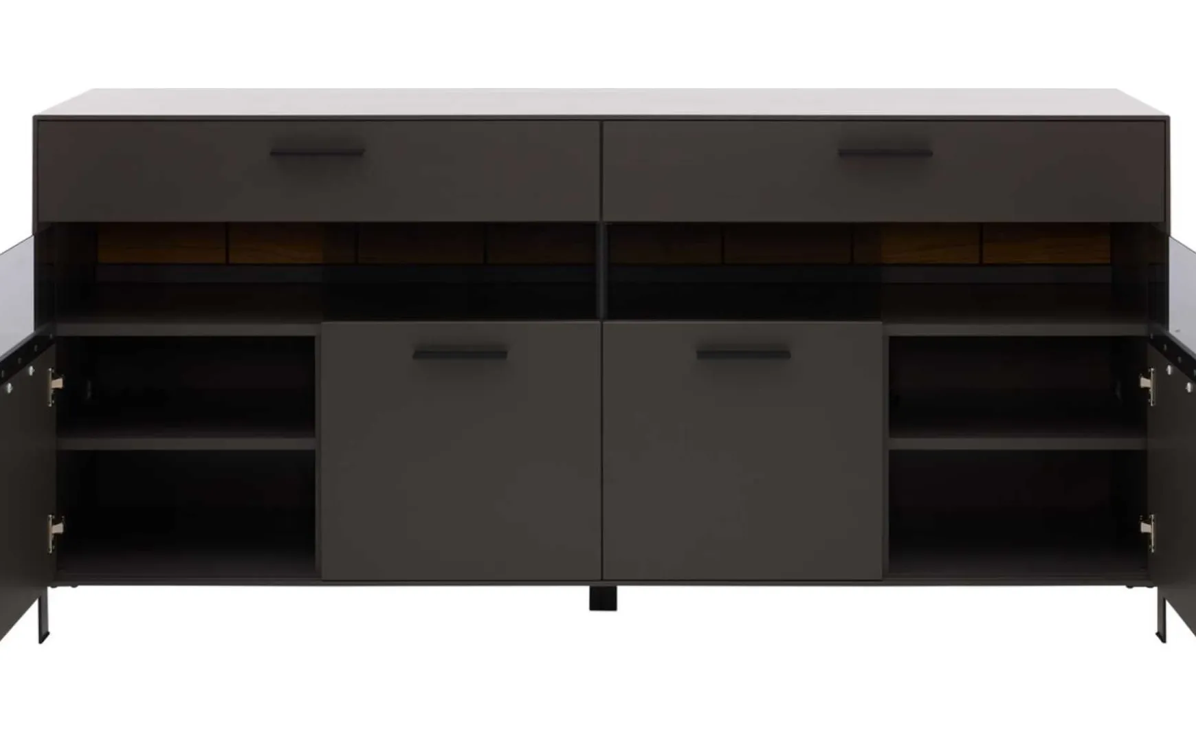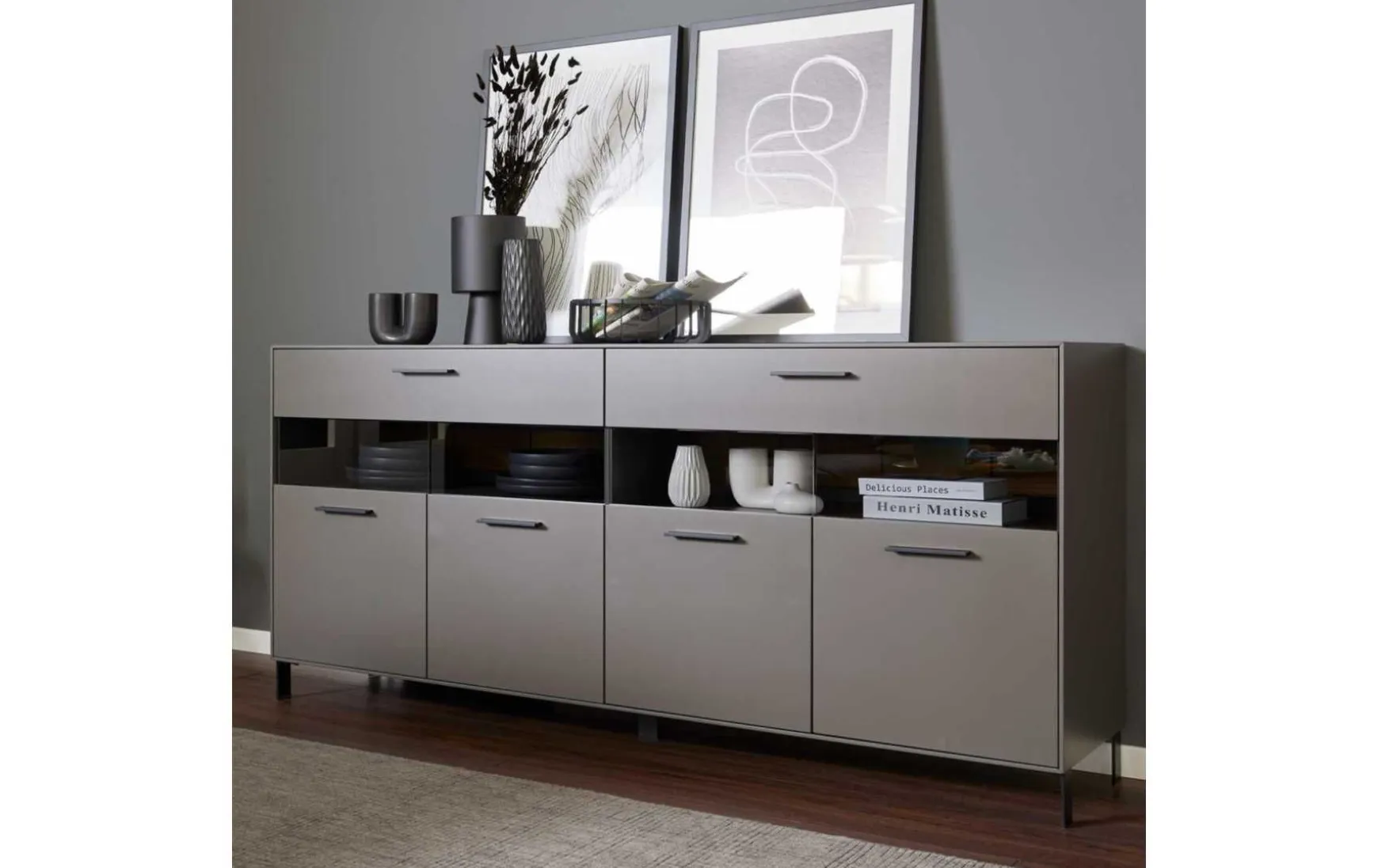 Das Sideboard überzeugt mit seinem stilvollen Design und der hohen Qualität. Seine wolframgrauen Lackoberflächen strahlen moderne Eleganz aus. Für das gewisse Etwas sorgen die Einsätze aus grauem Parsolglas, die sichtbaren Rückwände mit Spaltholz auf schwarzer MDF und die Details aus schwarz lackiertem Metall mit Feinstruktur. Hinter den vier Holztüren mit edlem Glaseinsatz im oberen Bereich befinden sich sechs Holzböden. Zusätzlich verfügt die Kommode über zwei Schubladen. Sie erhalten das Sideboard mit Maßen von ca. 180 x 86 x 45 cm (B/LxHxT)