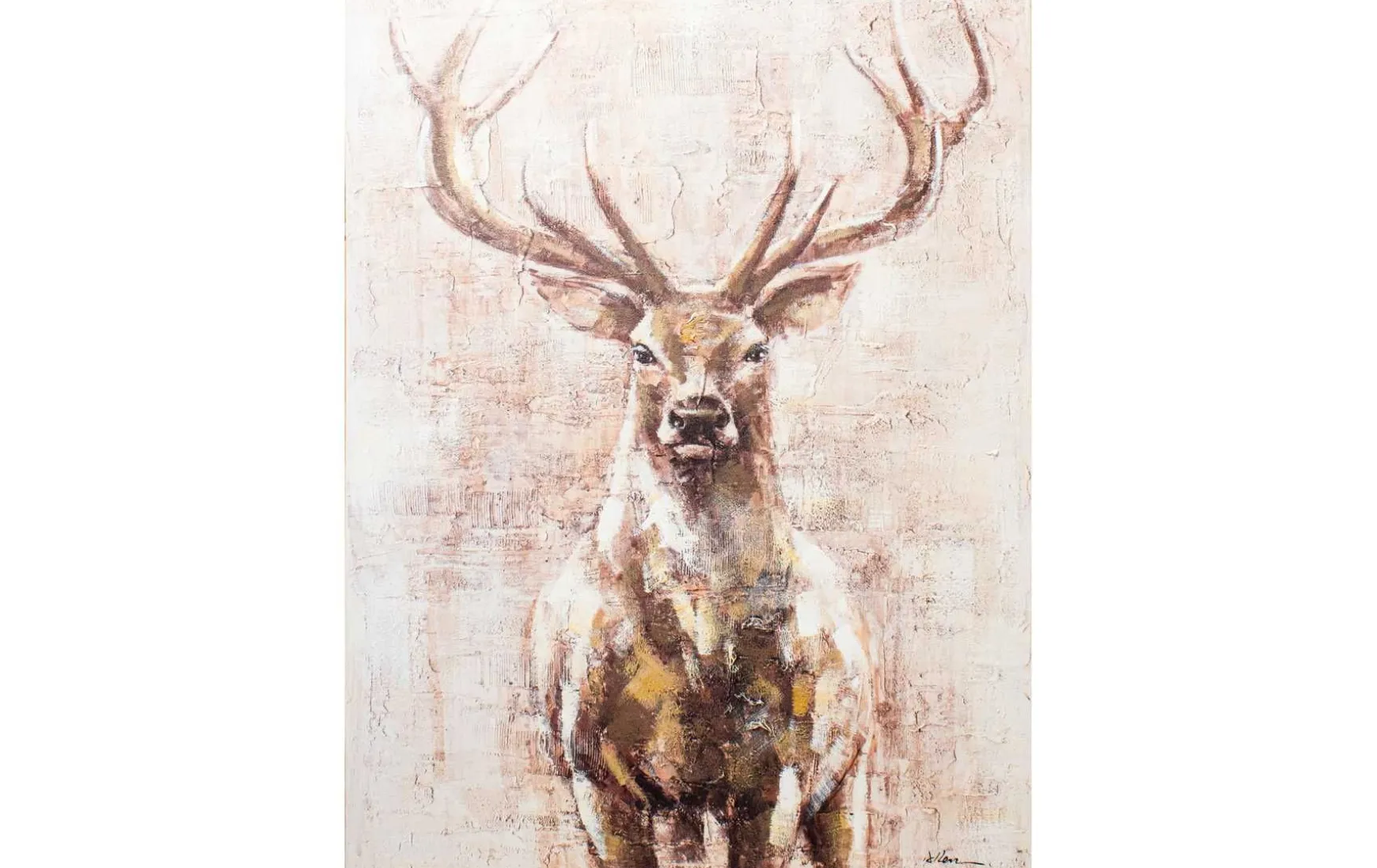 Dieses hochwertige Ölbild vom Hirsch in Frontalansicht bringt ein modernes, elegantes Flair in nahezu jeden Raum. Das handgemalte Kunstwerk besticht durch seine detaillierte Darstellung und ist ein stilvolles Highlight für Wohnzimmer, Esszimmer, Flur oder Büro. Das Bild wird fertig zum Aufhängen geliefert und ist sofort einsatzbereit. Mit den Gesamtmaßen inkl. Rahmen von 120 × 90 cm setzt es einen dekorativen Akzent an jeder Wand.