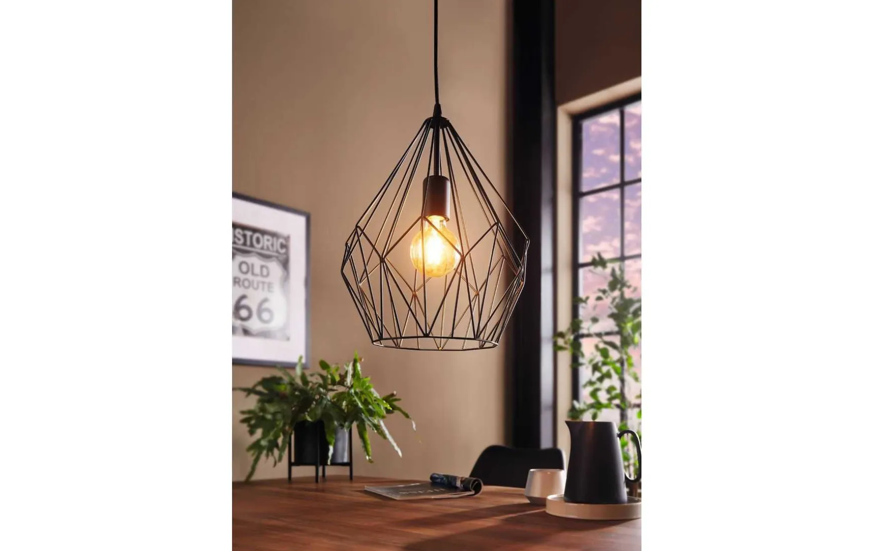 Diese Hängeleuchte ist aus schwarzem Stahl gefertigt. Sie verfügt über eine Schutzisolierung und benötigt zum Strahlen ein E27-Leuchtmittel.