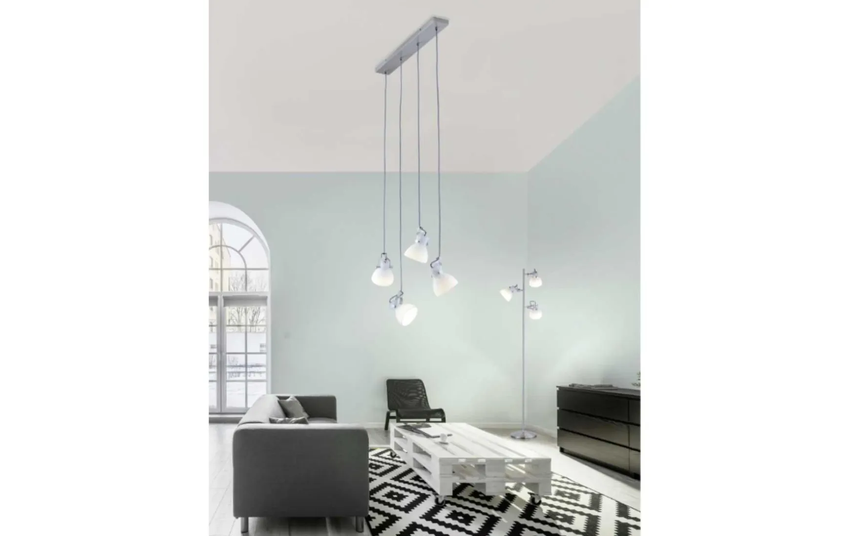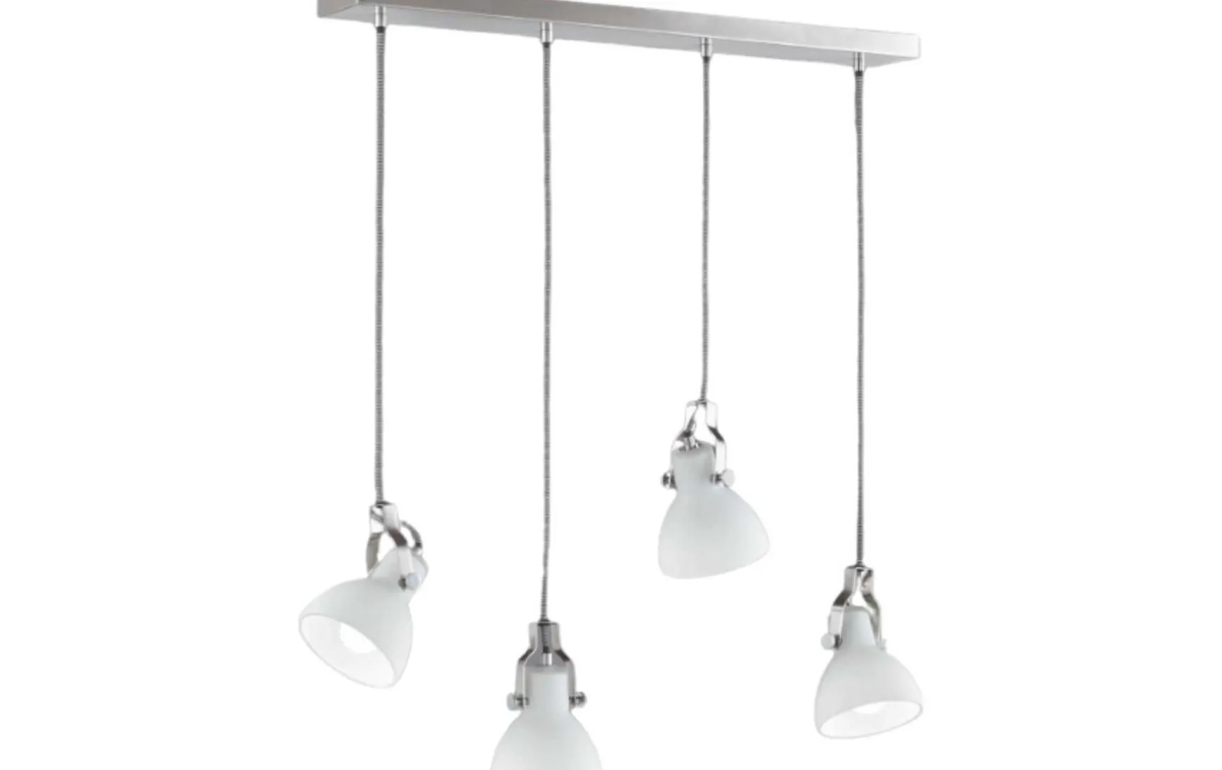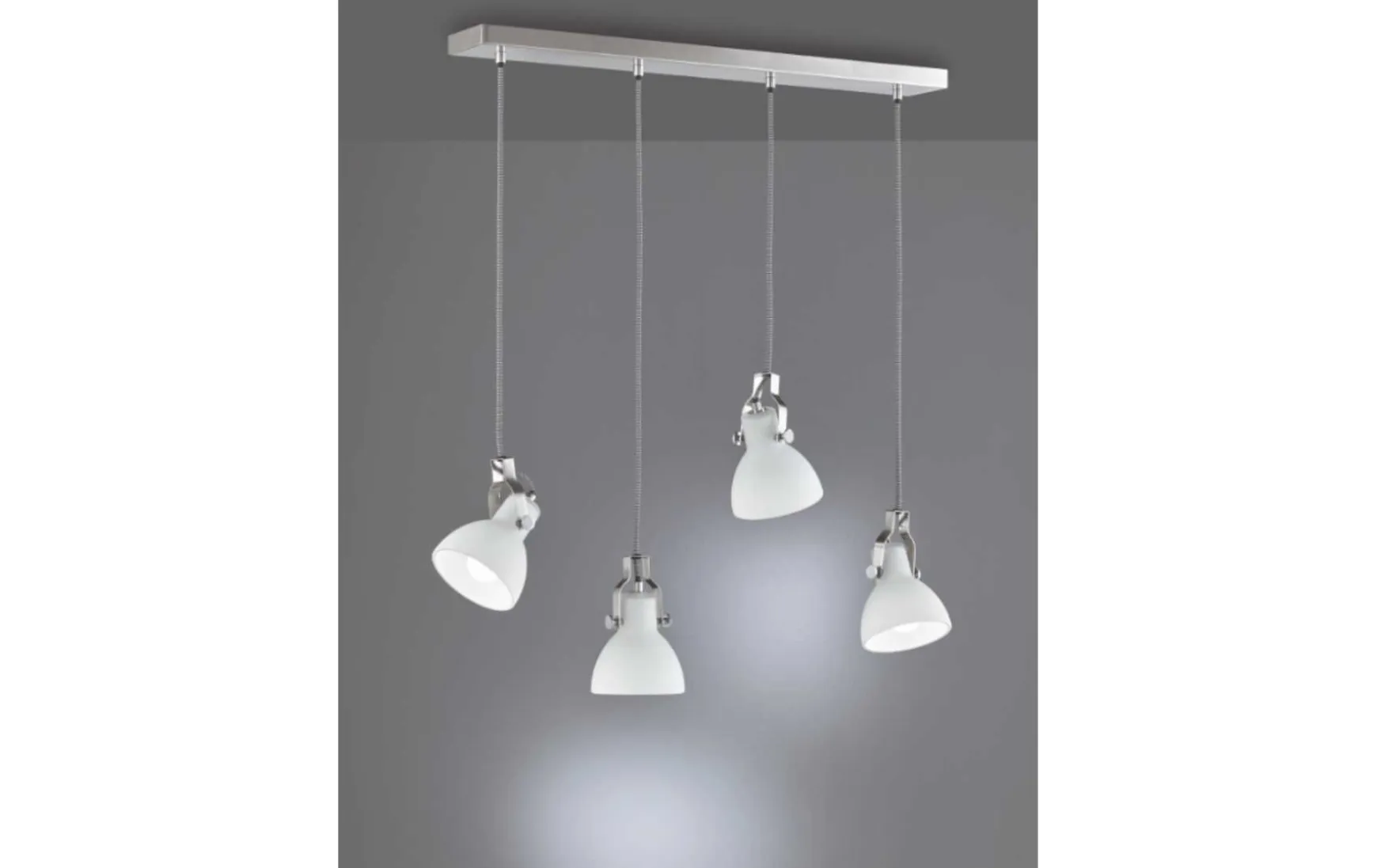 Mit dieser vierflammigen Pendelleuchte können harmonische Lichtergebnisse kreiert werden. Die Farb- und Materialkombination ergibt ein modernes Zusammenspiel, das sich jedem Anwendungsbereich optimal anpasst. Das gewünschte Licht wird angenehm durch das Glas gefiltert und an die Umgebung abgegeben. Die einzelnen Spots können sowohl in der Höhe als auch in der Ausrichtung individuell eingestellt werden. Das moderne und zugleich schlichte Design kommt besonders gut zur Geltung, wenn Sie im Essbereich mittig über dem Esstisch montiert wird. Der Mix aus Nickel matt, weißem Glas und dem schwarz-weißen Stoffkabel unterstreicht den modernen Charakter der Pendelleuchte und kann problemlos in vorhandene Farbkonzepte integriert werden.