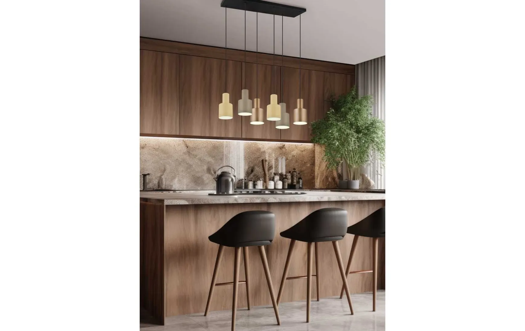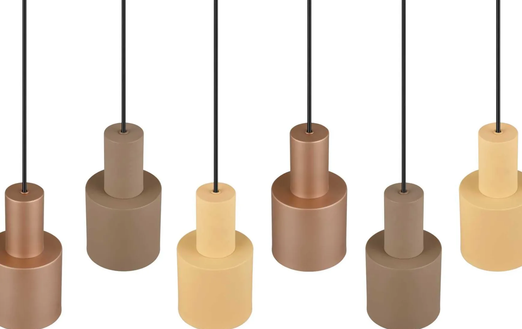 Leuchtschirme in unterschiedlichen Farbtönen und Höhen miteinander zu kombinieren, erzeugt Aufmerksamkeit und macht die Leuchte zu einem besonderen Gestaltungselement in Ihrem Zuhause. Die sechsflammige Pendelleuchte strahlt durch die natürliche Farbgebung und elegante Formsprache pure Gemütlichkeit und minimalistische Ästhetik aus. Über einem Ess- oder Wohnzimmertisch verbessert die Leuchte mit Ihrem warmen, natürlichen Erscheinungsbild das Raumklima. Die charakteristische Farbkombination aus gedeckten Naturfarben sowie Schwarz matt verleiht der Leuchte Stil. Das matte Metall-Finish der Leuchtschirme rundet die Leuchte perfekt zu einem eleganten Highlight ab. Für eine energiesparende Beleuchtung empfiehlt sich die Verwendung eines LED Leuchtmittels. Diese sind eine optimale Alternative zu herkömmlichen Halogen Leuchtmitteln und stehen für eine hohe Lichtqualität und eine Energieeinsparung von bis zu 80%. Zusätzlich profitieren Sie bei LED Leuchtmitteln von einer langen Lebensdauer, einer geringen Wärmeentwicklung und schonen gleichzeitig die Umwelt.