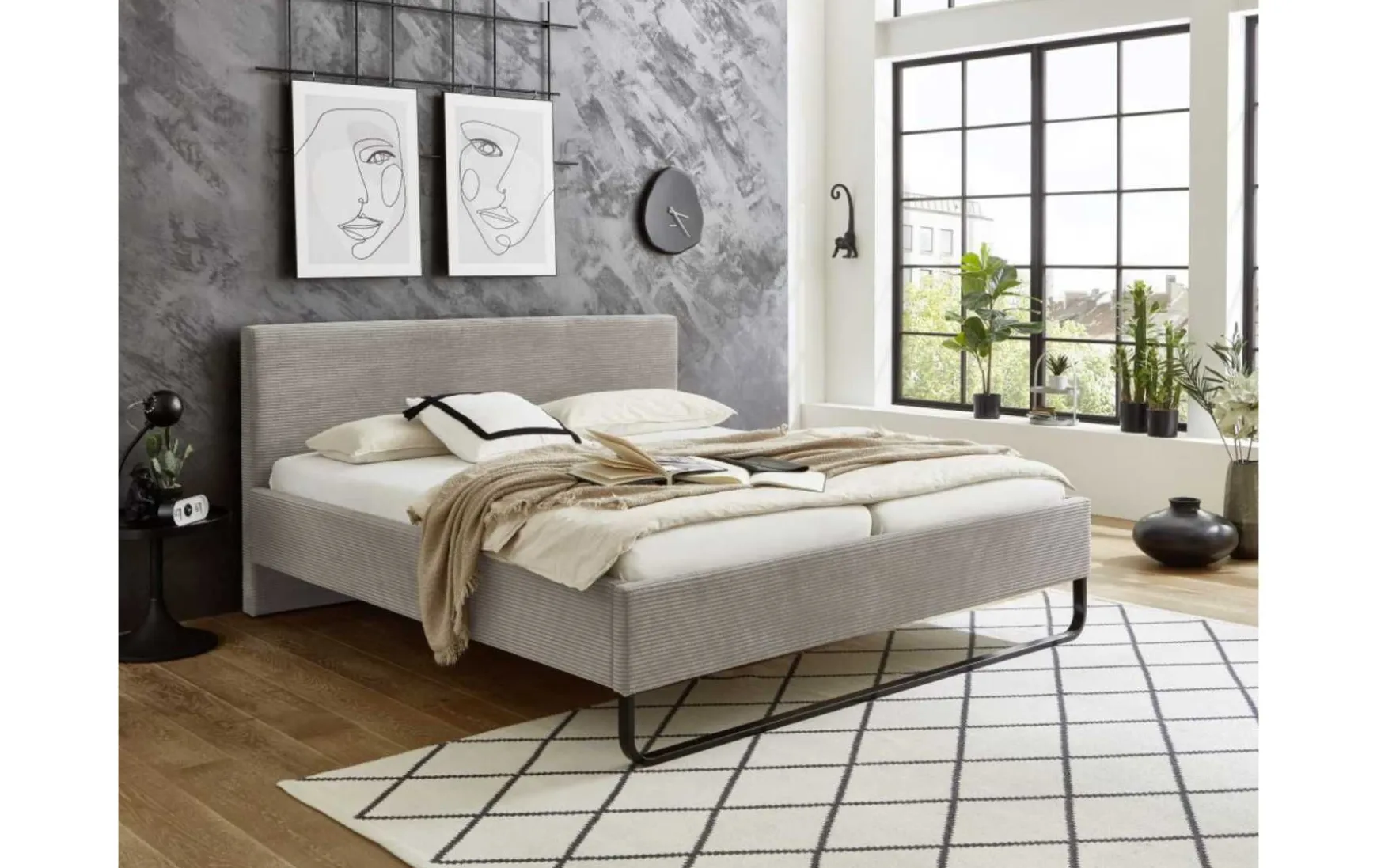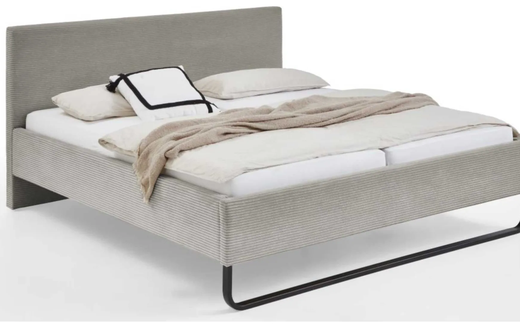 Dieses stilvolle Polsterbett überzeugt mit modernem Design und hohem Wohlfühlfaktor. Der hochwertige Cord-Stoffbezug in elegantem Taupe verleiht dem Bett eine warme, trendbewusste Ausstrahlung und sorgt zugleich für eine angenehm weiche Haptik. Mit einer großzügigen Liegefläche von ca. 180 × 200 cm bietet das Polsterbett viel Platz für erholsamen Schlaf. Die schwarzen Metallkufen setzen einen modernen Kontrast zum Stoffbezug und sorgen für Stabilität sowie einen leichten, schwebenden Look. Ein perfektes Schlafzimmermöbel für alle, die Komfort und zeitgemäßes Design harmonisch verbinden möchten.