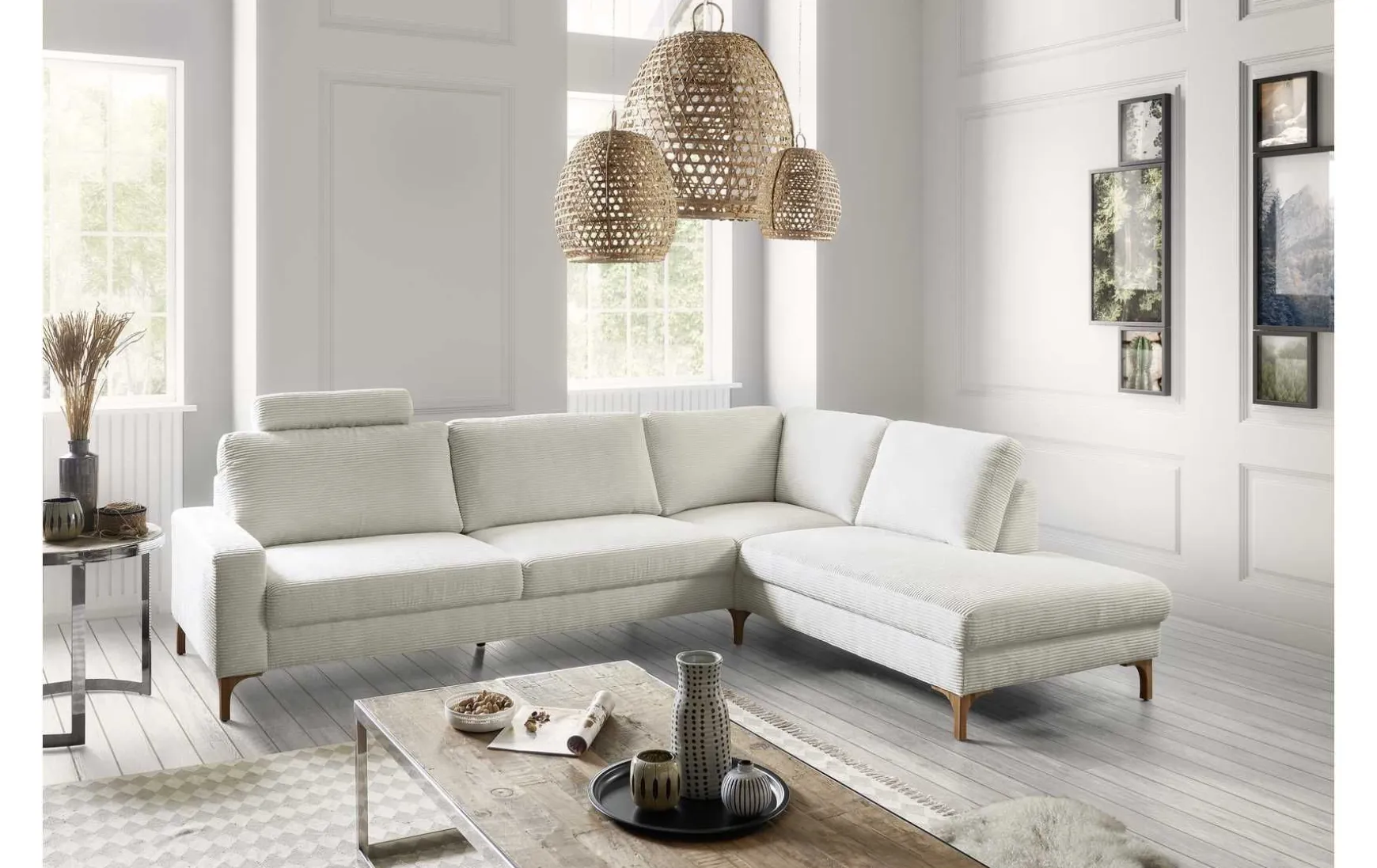 Diese stilvolle Polsterecke in trendigem Cord Snow vereint modernes Design mit hohem Sitzkomfort und praktischer Funktionalität. Die helle Farbgebung sorgt für eine freundliche, wohnliche Atmosphäre, während die geölten Eichefüße einen natürlichen Akzent setzen. Dank der großzügigen L-Form und der komfortablen Polsterung mit Tonnentaschenfederkern lädt das Sofa zum Entspannen ein. Zusätzlich bietet integrierter Stauraum eine clevere Lösung für Decken oder Kissen. Die Polsterecke ist individuell konfigurierbar und passt sich so optimal Ihren Wohnwünschen an.