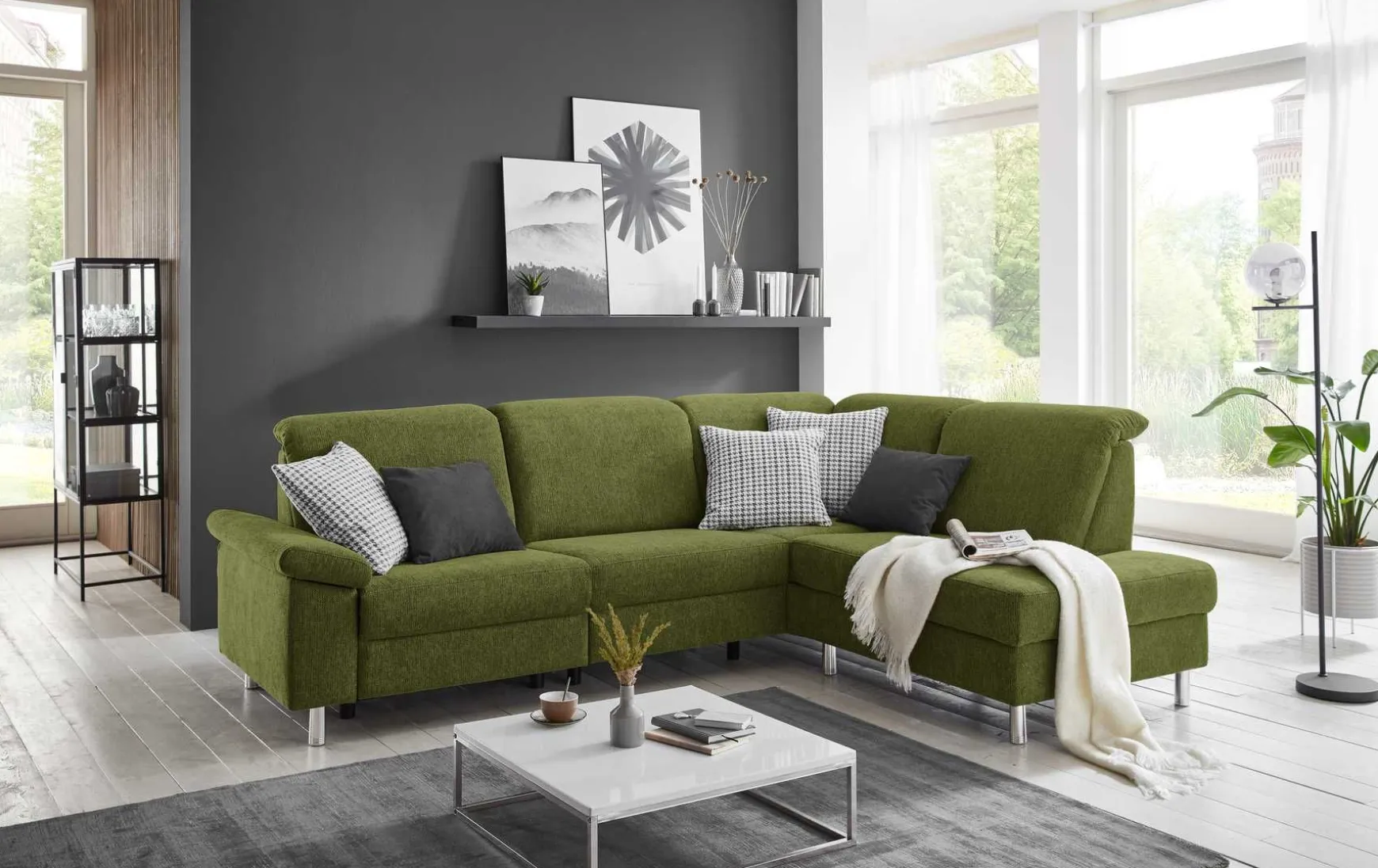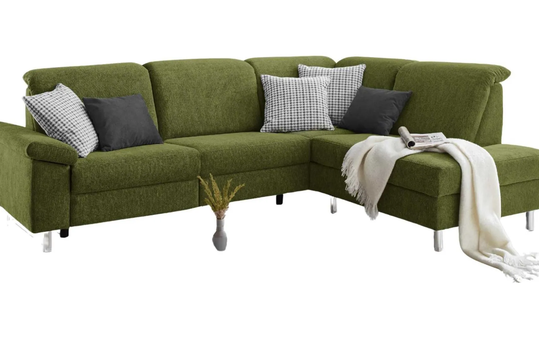 Diese moderne Polsterecke überzeugt mit tierfreundlichem WOW-Stoff in stilvollem Olivgrün und kombiniert Design, Komfort und innovative Funktionalität. Die motorische Vorziehbank ermöglicht auf Knopfdruck eine komfortable Relax- oder Liegeposition und macht das Sofa zum idealen Ort für entspannte Abende. Das Anbausofa auf der rechten Seite ist aufklappbar und bietet zusätzlichen Platz sowie praktischen Mehrwert.