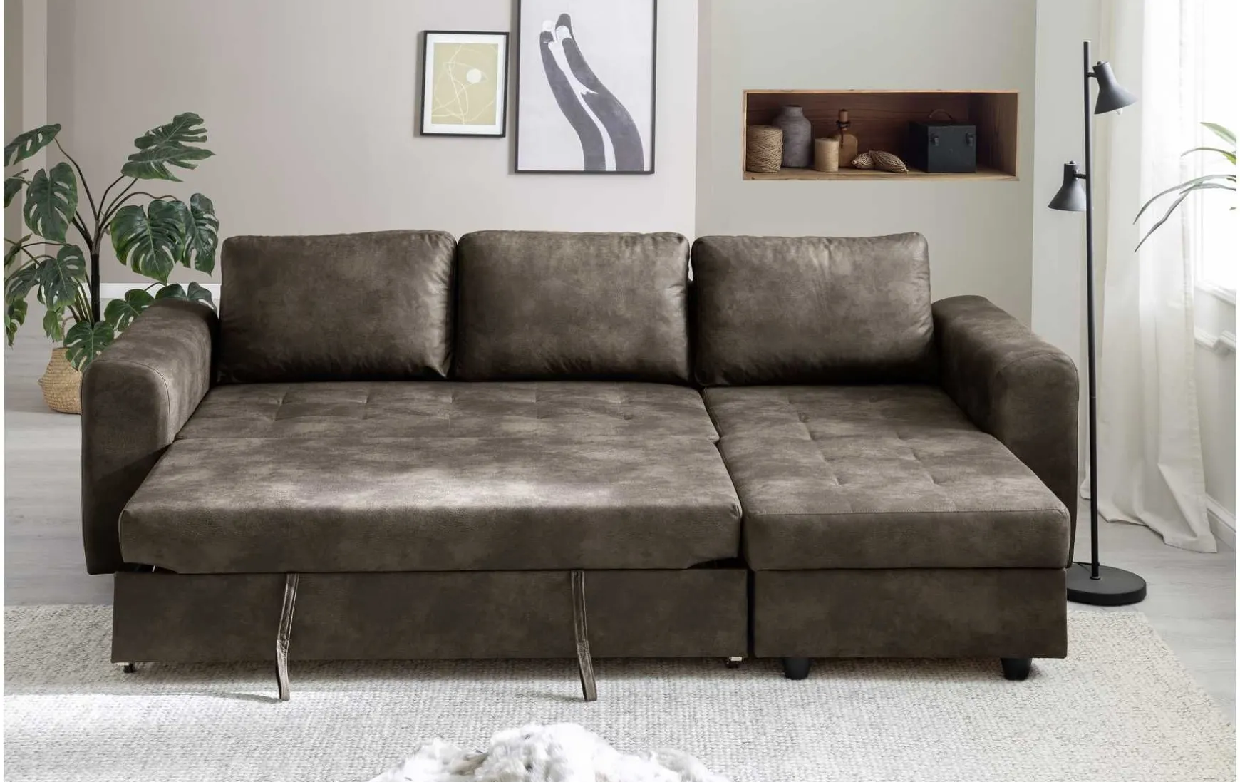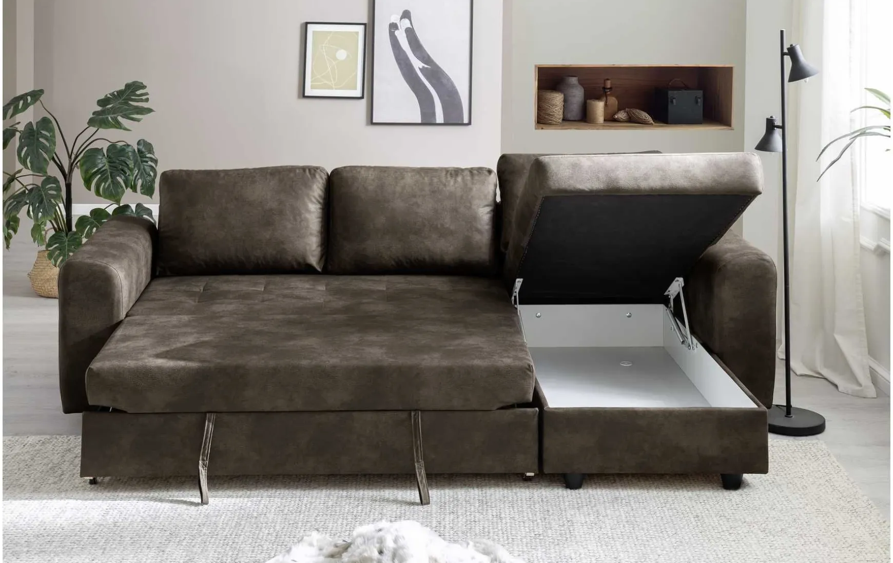 Unsere Polsterecke besteht aus einem dunkel braunen Microfaserbezug (100% Polyethylen), welcher nicht nur angenehm zur Haut ist, sondern auch wunderbar pflegeleicht. Die Antiklederoptik lädt Sie zu gemütlichen Stunden der Entspannung ein. Mit wenigen Handgriffen zaubern Sie ein komfortables Gästebett. Unter der Ottomane lassen sich Kissen und Bettwäsche sicher und staubfrei verstauen. Für einen angenehmen Sitz-und Liegekomfort sorgt der atmungsaktive Polyätherschaum auf Wellenunterfederung. Die Ottomane kann nach räumlichen Gegebenheiten wahlweise links oder rechts montiert werden. Unsere Funktionsecke lässt sich frei im Raum platzieren, dank dem echtbezogenen Rücken und ist in verschiedenen Wohnstilen integrierbar.