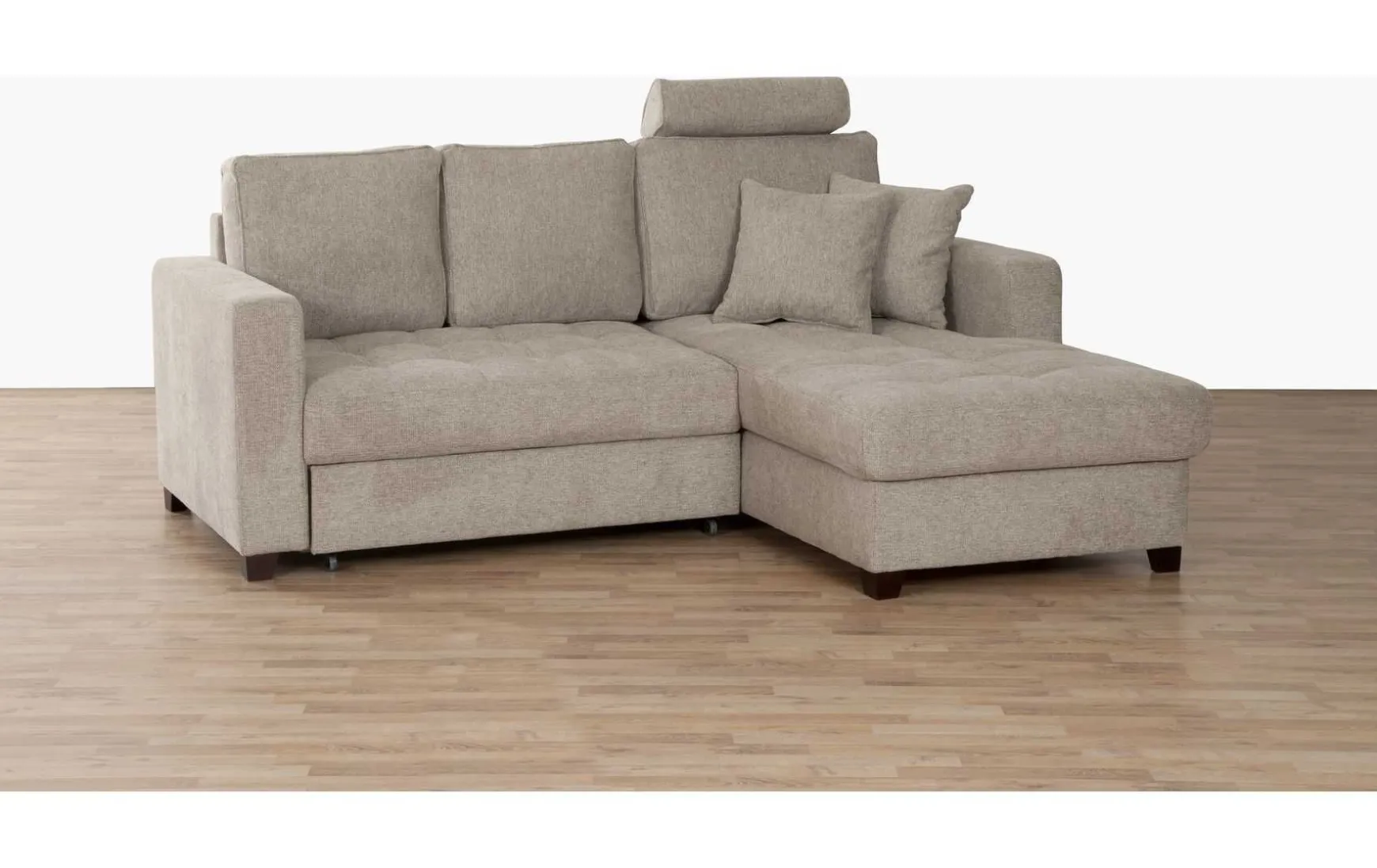 Moderne Polsterecke in L-Form mit echt bezogenem Rücken und hochwertigem Stoffbezug in Beige/Braun. Inklusive 2 Zierkissen, bequeme Kaltschaum-Polsterung und stabile schwarze Metallfüße.