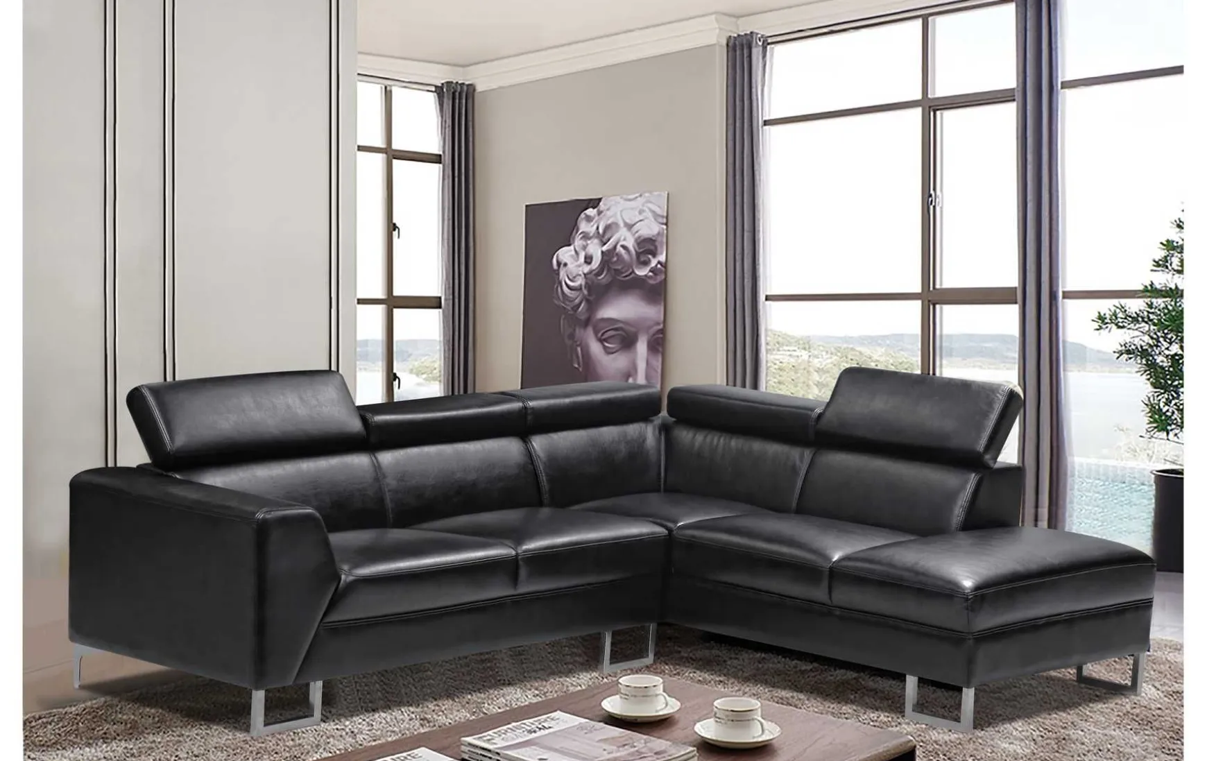 Diese moderne Polsterecke überzeugt mit einem eleganten Stoffbezug in schwarzer Lederoptik und fügt sich stilvoll in jedes Wohnambiente ein. Der hochwertige Federkern sorgt für hohen Sitzkomfort, während die zwei integrierten Kopfteilverstellungen individuellen Komfort ermöglichen. Die großzügige L-Form mit stabilen Metallfüßen bietet viel Platz zum Entspannen und macht die Polsterecke zum idealen Mittelpunkt des Wohnzimmers.