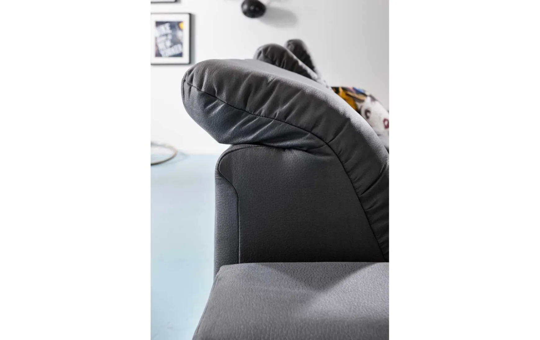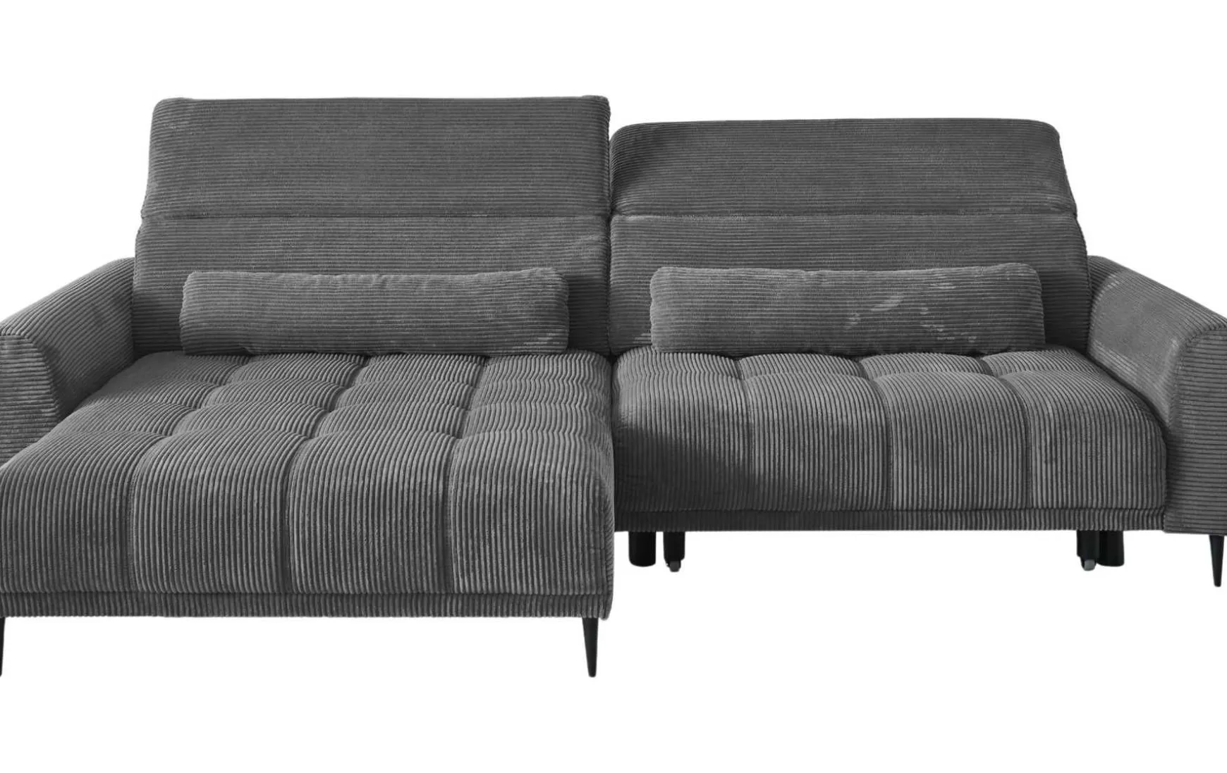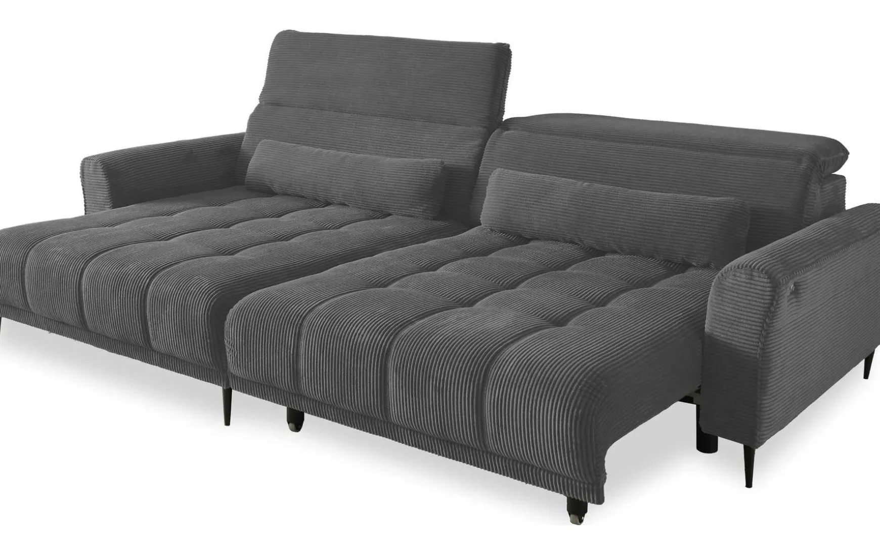 Diese moderne Polsterecke mit Ottomane links überzeugt durch trendigen Cordbezug in elegantem Anthrazit und hohen Komfort. Ausgestattet mit integrierter Bettfunktion bietet sie eine großzügige Liegefläche von ca. 126 × 240 cm. Die elektrische Sitztiefenverstellung sowie zwei manuell verstellbare Kopfteile und zwei Nierenkissen sorgen für individuelle Entspannung. Mit Maßen von ca. 277 × 179 × 80 cm (B/T/H), einer angenehmen Sitzhöhe von ca. 43 cm und stabilen Metallfüßen ist die L-förmige Polsterecke ein komfortables und stilvolles Highlight für moderne Wohnräume.