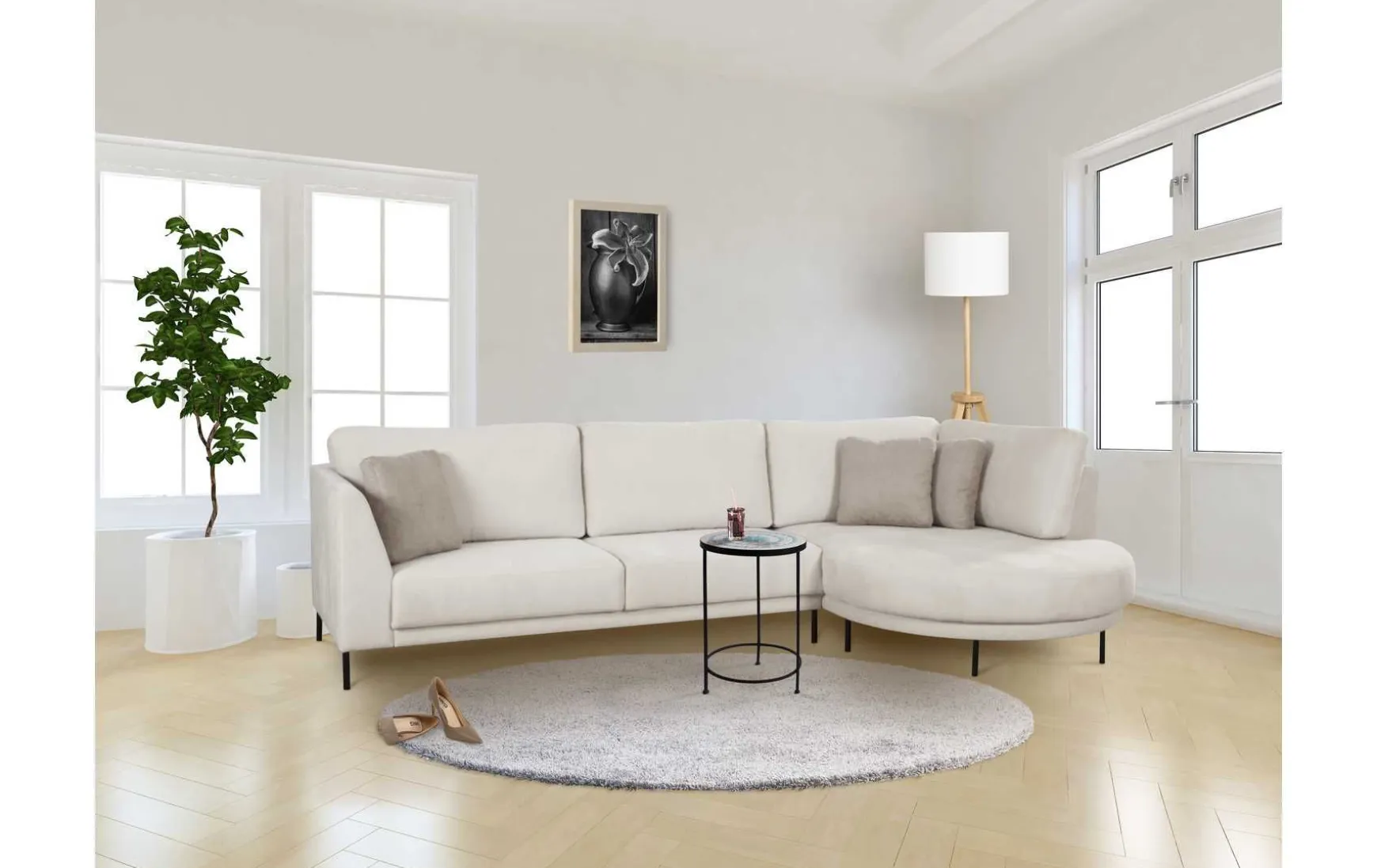 Diese stilvolle Polsterecke in moderner L-Form überzeugt durch hohen Sitzkomfort und ein zeitloses Design im Konsum-Stil. Die komfortable Sitzpolsterung aus Kaltschaum in Kombination mit einer langlebigen Nosagfederung sorgt für angenehmes Sitzen und Entspannen im Alltag. Mit großzügigen Schenkelmaßen von ca. 176 x 317 cm bietet die Polsterecke viel Platz für Familie und Gäste. Dank „Rücken echt“ ist das Sofa frei im Raum platzierbar und fügt sich flexibel in unterschiedliche Wohnkonzepte ein. Die dezente Farbgebung in Beige mit schwarzen Metallfüßen verleiht dem Möbel eine elegante Note. Individuell konfigurierbar und in weiteren Farbvarianten erhältlich, lässt sich die Polsterecke optimal an persönliche Wohnwünsche anpassen. Der optionale Hocker ist gegen Mehrpreis erhältlich. Vormontiert geliefert, ist das Sofa sofort einsatzbereit.
