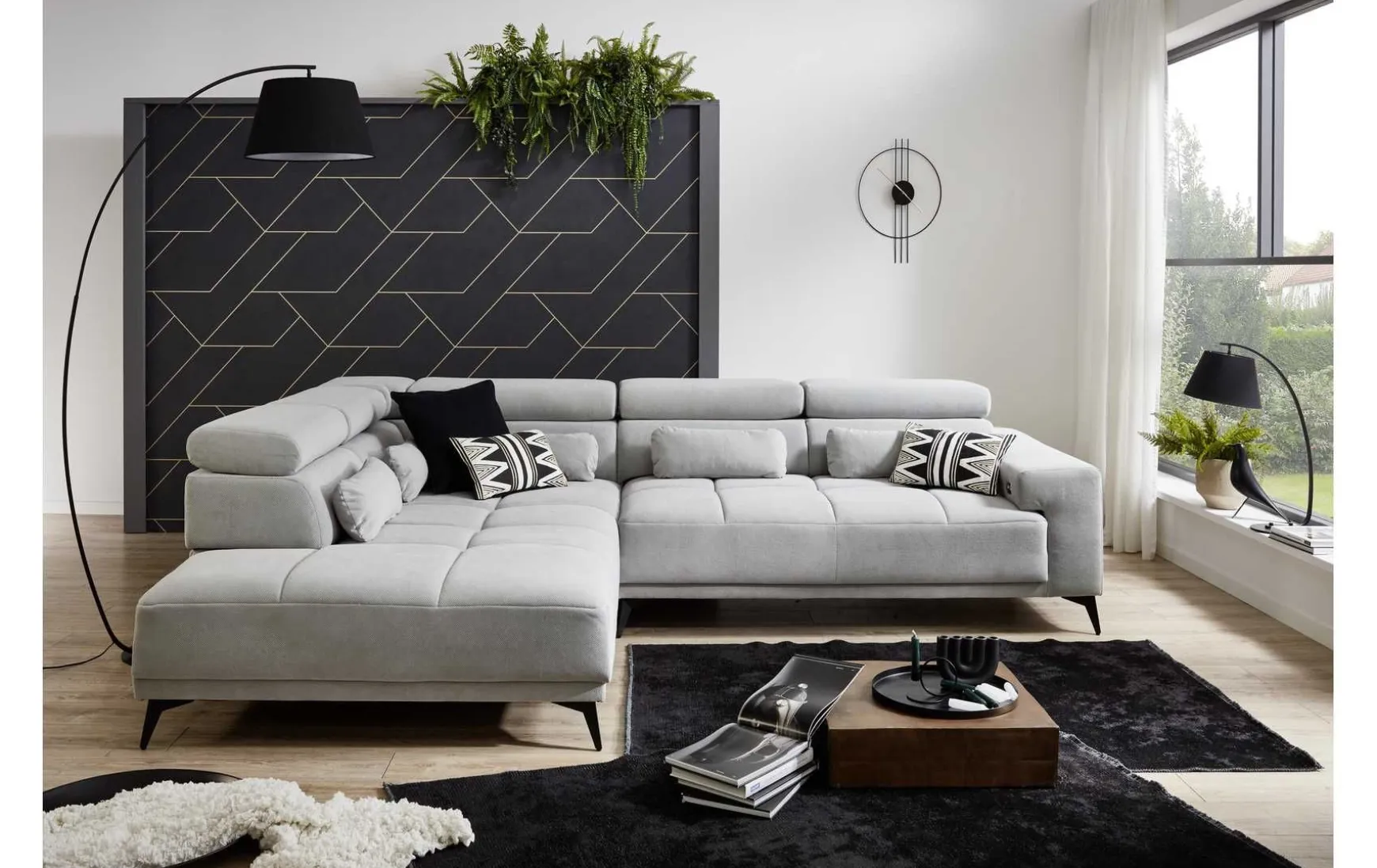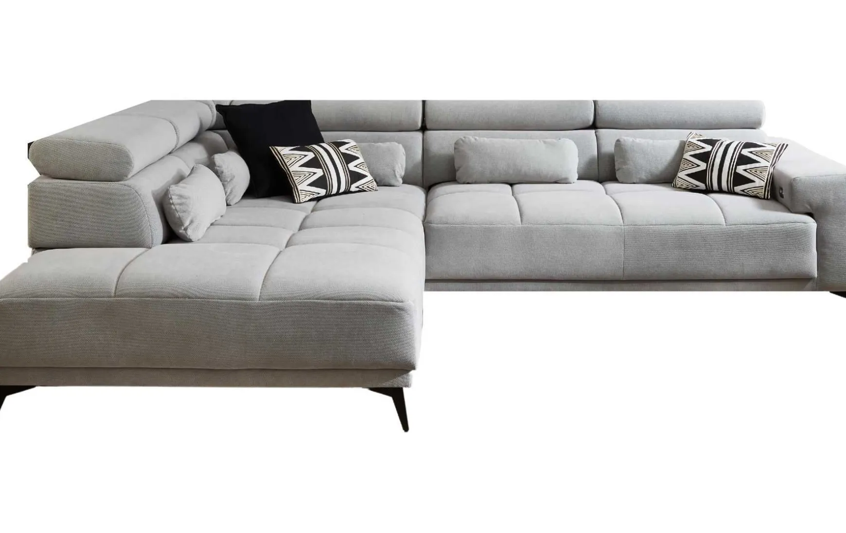 Die moderne Polsterecke überzeugt durch großzügiges Design und hohen Sitzkomfort. Die Ottomane auf der rechten Seite sowie die L-Form bieten viel Platz zum Entspannen. Dank optionaler Sitztiefenverstellung, integrierter Kopfteilverstellung und mitgeliefertem Nierenkissen lässt sich der Komfort individuell anpassen. Die hochwertige Polsterung mit Nosagunterfederung und Bonellfederkern sorgt für angenehmes Sitzen. Der Stoffbezug in Chrystal Grau harmoniert mit den schwarzen, gepulverten Metallfüßen. Pflegeleicht, vormontiert geliefert und in weiteren Farbvarianten erhältlich.