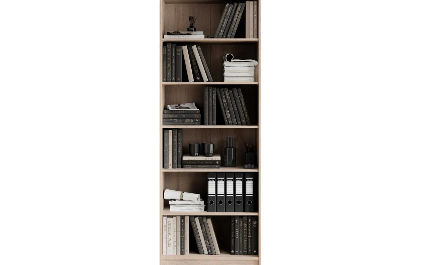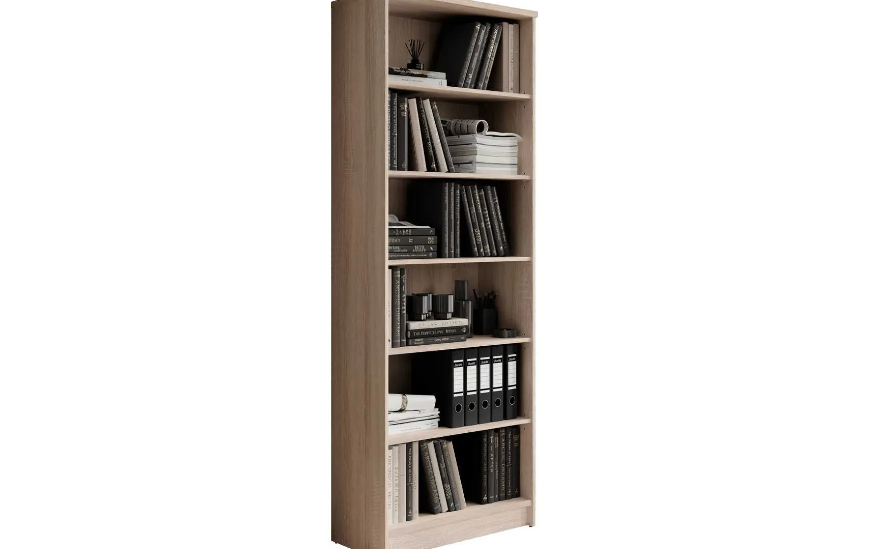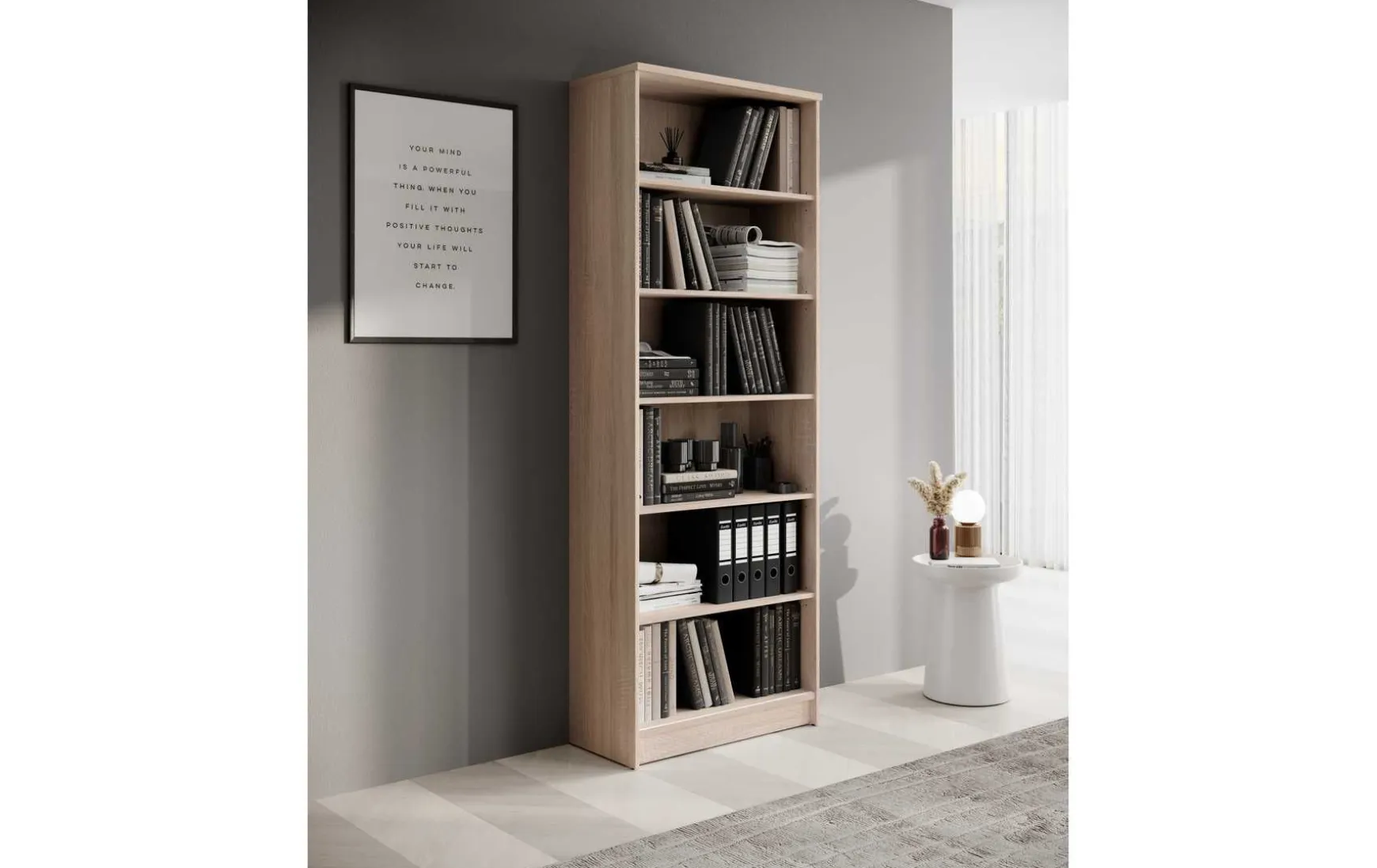 Das Regal in Eiche Sonoma Dekor überzeugt durch sein zeitloses und modernes Design und eignet sich ideal für Wohnzimmer, Büro oder Schlafzimmer. Der Korpus aus melaminbeschichtetem Holzwerkstoff sorgt für eine robuste und pflegeleichte Oberfläche. Mit 6 offenen Fächern bietet das Regal viel Stauraum für Bücher, Ordner oder Dekoration. Dank seiner großzügigen Maße von ca. 72 × 198 × 34 cm (B/H/T) bietet es viel Platz und nutzt die Höhe des Raumes optimal aus. Die schwarzen Kunststofffüße setzen einen modernen Akzent und sorgen für einen stabilen Stand. Zur Reinigung genügt ein trockenes Staubtuch, auf lösungsmittelhaltige oder scheuernde Reinigungsmittel sollte verzichtet werden. Das Regal wird zerlegt geliefert.
