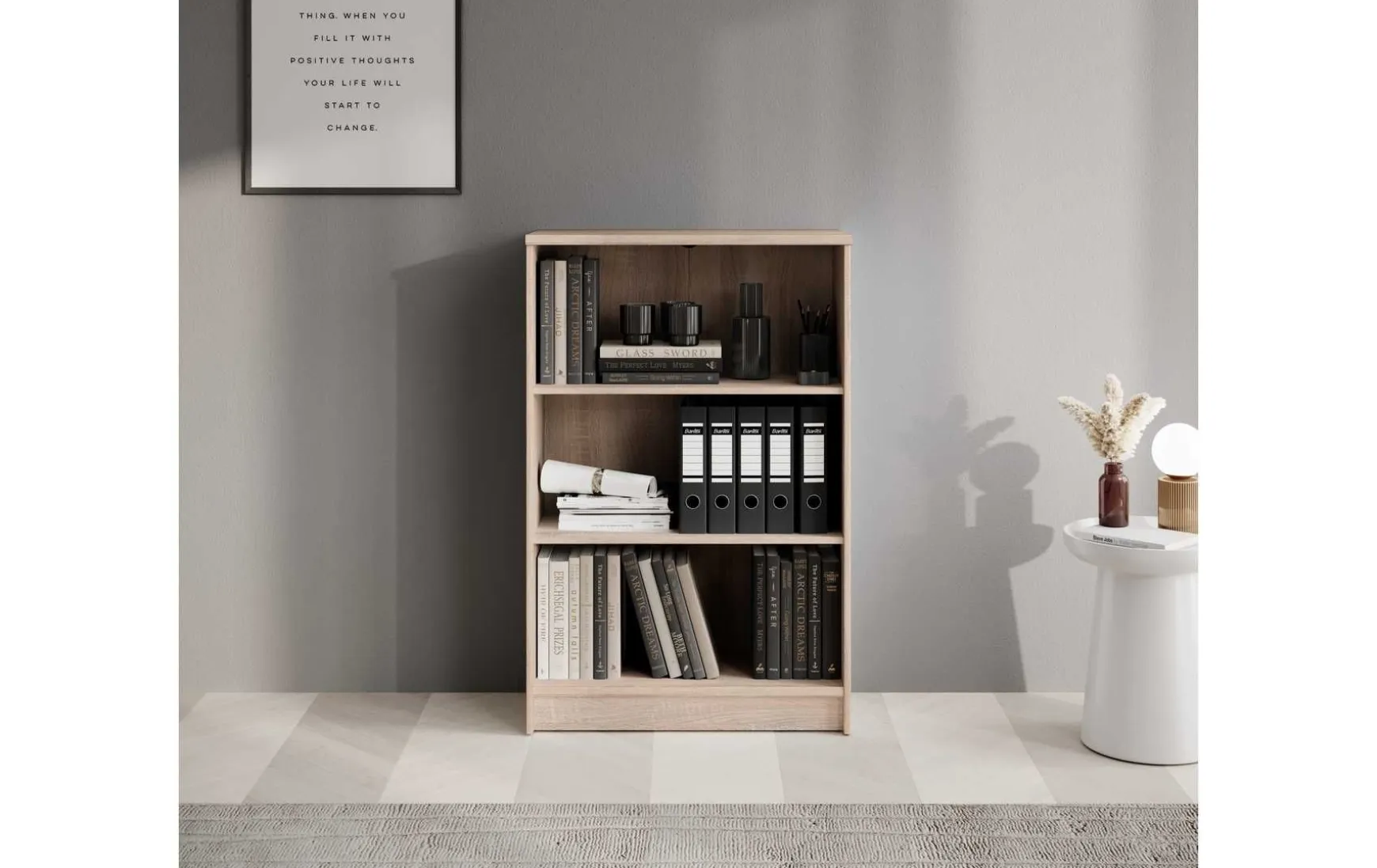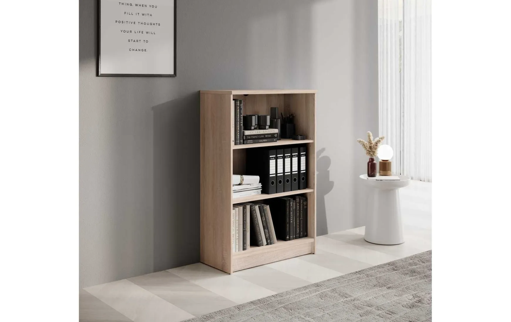 Das Regal im Eiche Sonoma Dekor überzeugt durch sein zeitloses und modernes Design und passt ideal in Wohnzimmer, Büro oder Schlafzimmer. Der Korpus aus melaminbeschichtetem Holzwerkstoff sorgt für eine pflegeleichte und langlebige Oberfläche. Mit 3 offenen Fächern bietet das Regal praktischen Stauraum für Bücher, Ordner oder Dekoration. Dank seiner Maße von ca. 72 × 111 × 34 cm (B/H/T) bietet es viel Platz, ohne zu viel Raum einzunehmen. Die schwarzen Kunststofffüße setzen einen modernen Akzent und sorgen für einen stabilen Stand. Zur Pflege genügt ein trockenes Staubtuch, auf lösungsmittelhaltige oder scheuernde Reinigungsmittel sollte verzichtet werden. Das Regal wird zerlegt geliefert, Dekoration ist nicht im Preis enthalten.
