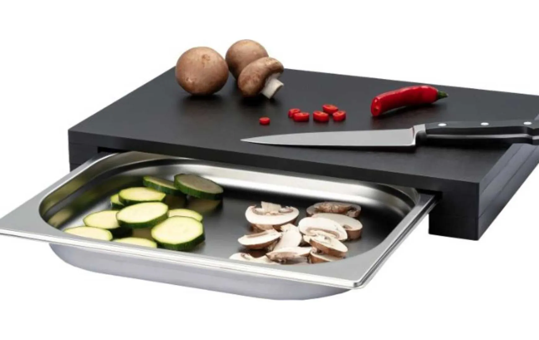 Dieses Multifunktionsbrett mit Edelstahlschublade hat rutschfeste Füße.