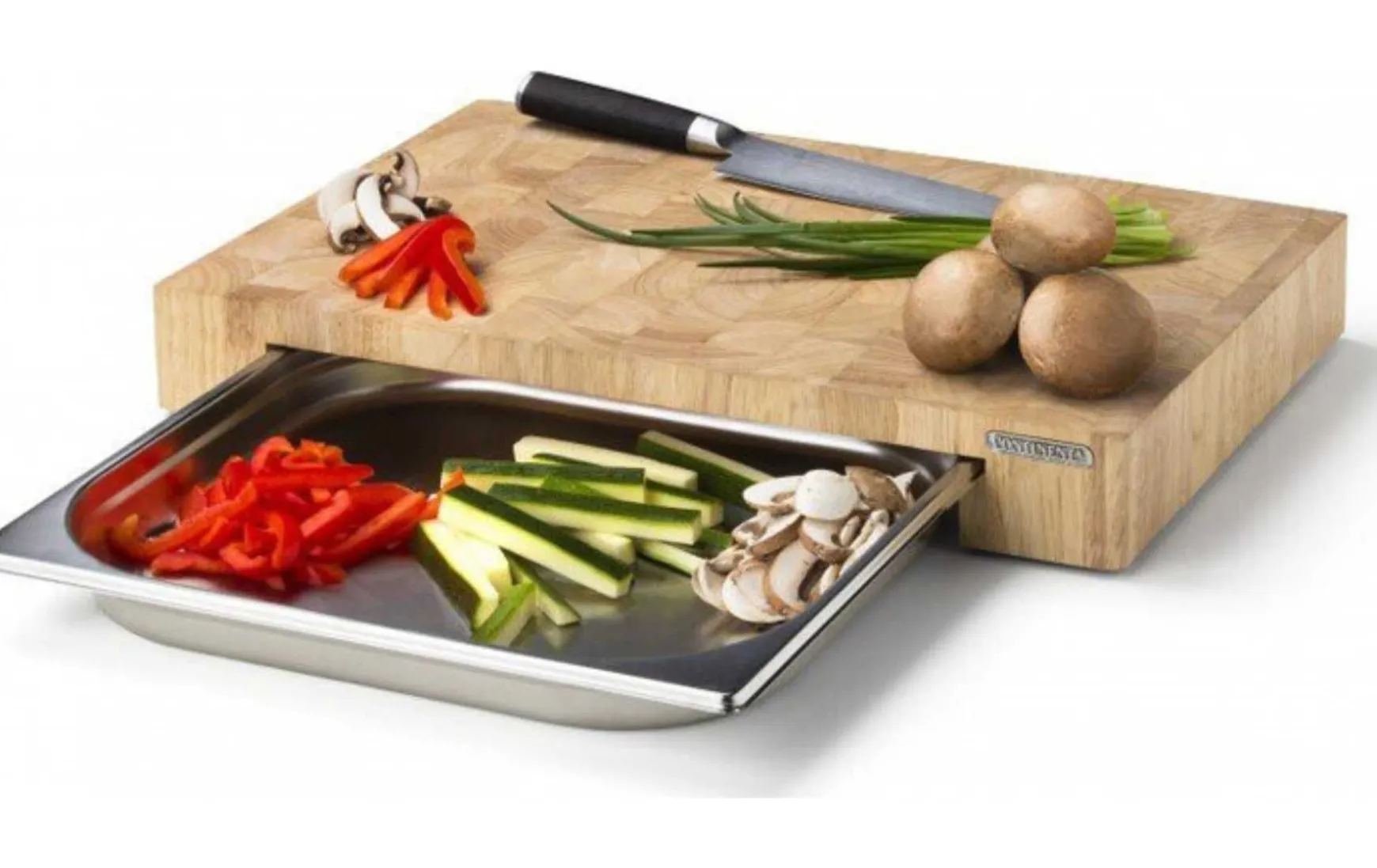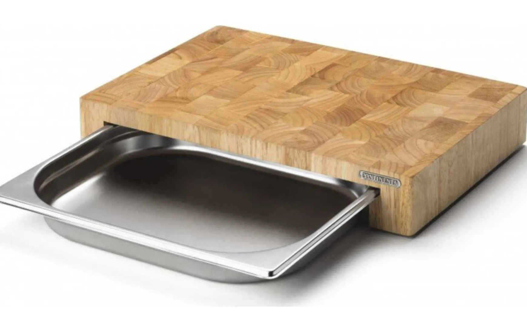 Das Schneidebrett mit Edelstahl-Schublade aus Stirnholz ist besonders praktisch. Wenn Du fertig bist mit Schneiden, kannst Du das Kleingeschnittene oder den Abfall in der Edelstahlschublade ablegen. Die Schublade ist beidseitig entnehmbar. Das Holzbrett bietet sicheren Stand durch rutschfeste Gummifüße.