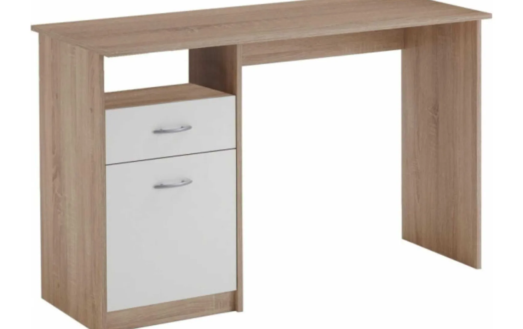 Stabiler Schreibtisch ganz frisch aus der Möbelmesse in der neuen zeitgemässen Farbe Eiche Sägerau Dekor und weiss. Ausgestattet ist der Arbeitstisch mit 1 Schublade auf kugelgelagerten Metall – Laufschienen und 1 Türe. Stabile Verarbeitung mit Metallbeschlägen und einfacher Montageanleitung damit der Tisch problemlos montiert werden kann.
