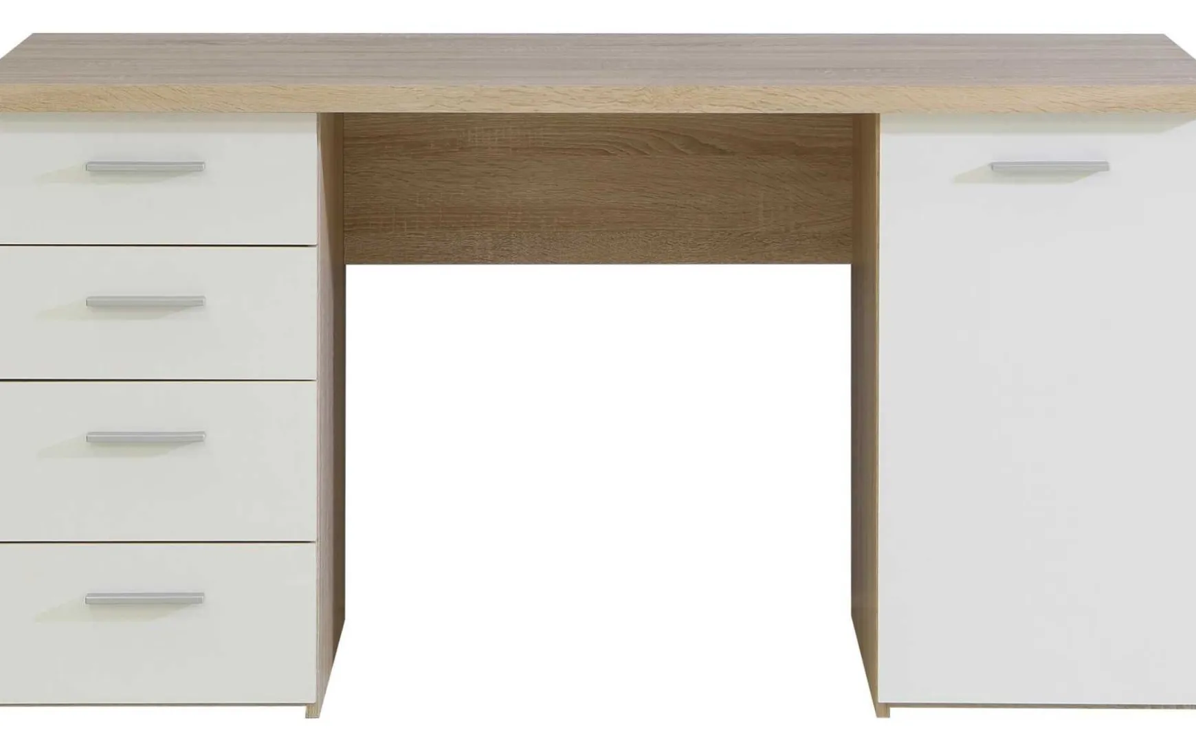 Dieser elegante und zeitlose Schreibtisch im modernen Design vereint Stil und Funktionalität für Ihr Homeoffice oder Arbeitszimmer. Die Kombination aus Eiche Sand Dekor und weißer Front in Matt-Optik sorgt für eine helle, freundliche Atmosphäre, während aluminiumfarbene Griffe dezente Akzente setzen.