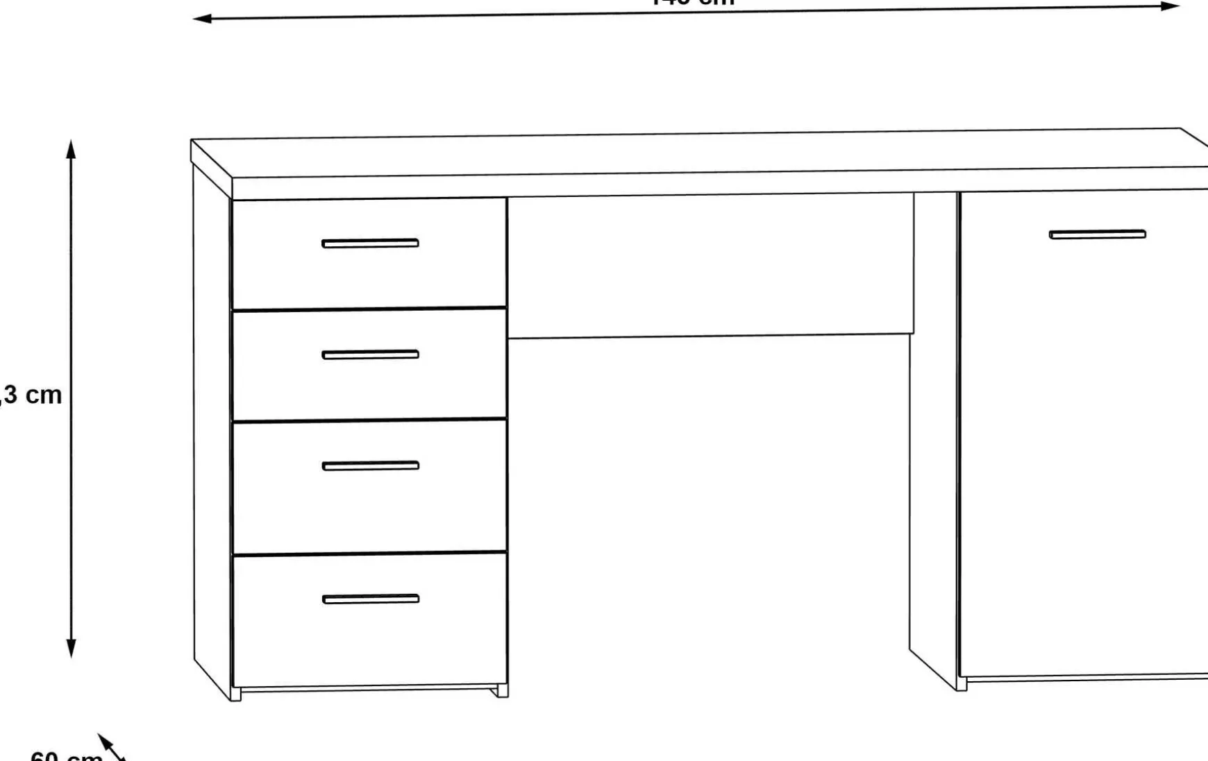 Mit einer großzügigen Arbeitsfläche von ca. 145 × 60 × 73 cm (B/T/H) bietet der Schreibtisch viel Platz für Computer, Unterlagen und Bürogeräte. Vier Schubladen, eine Tür und zwei offene Fächer ermöglichen eine übersichtliche Aufbewahrung von Dokumenten, Büromaterial und persönlichen Gegenständen. Die Tischplatte ist bis ca. 20 kg belastbar und die glatten Oberflächen lassen sich einfach feucht abwischen, wodurch der Schreibtisch besonders pflegeleicht ist.