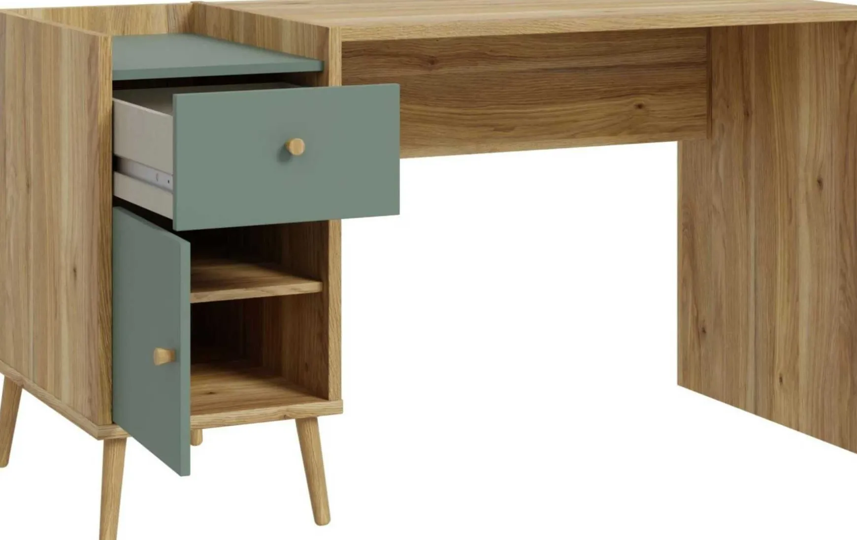 Der Schreibtisch im skandinavischen Look verbindet funktionales Design mit natürlicher Eleganz und bietet viel Stauraum für einen aufgeräumten Arbeitsplatz. Die Beine und Griffe aus Eiche natur setzen warme Akzente und harmonieren perfekt mit dem salbeigrünen Korpus in Mauvella Eiche NB. Ausgestattet mit einer Drehtür und einer Schublade, beide mit Soft-Close-Funktion, ermöglicht der Schreibtisch ein leises und komfortables Öffnen und Schließen. Mit einer maximalen Belastbarkeit von ca. 40 kg sowie Maßen von ca. 140 x 60 x 78 cm (Breite / Tiefe / Höhe) bietet er ausreichend Arbeitsfläche und Stabilität. Gefertigt aus robustem Holzwerkstoff überzeugt der Tisch durch Langlebigkeit bei einem Gewicht von ca. 38,7 kg. Die pflegeleichte Oberfläche lässt sich einfach trocken abwischen. Der Schreibtisch wird zerlegt geliefert und ist ideal für Homeoffice, Jugend- oder Arbeitszimmer geeignet.