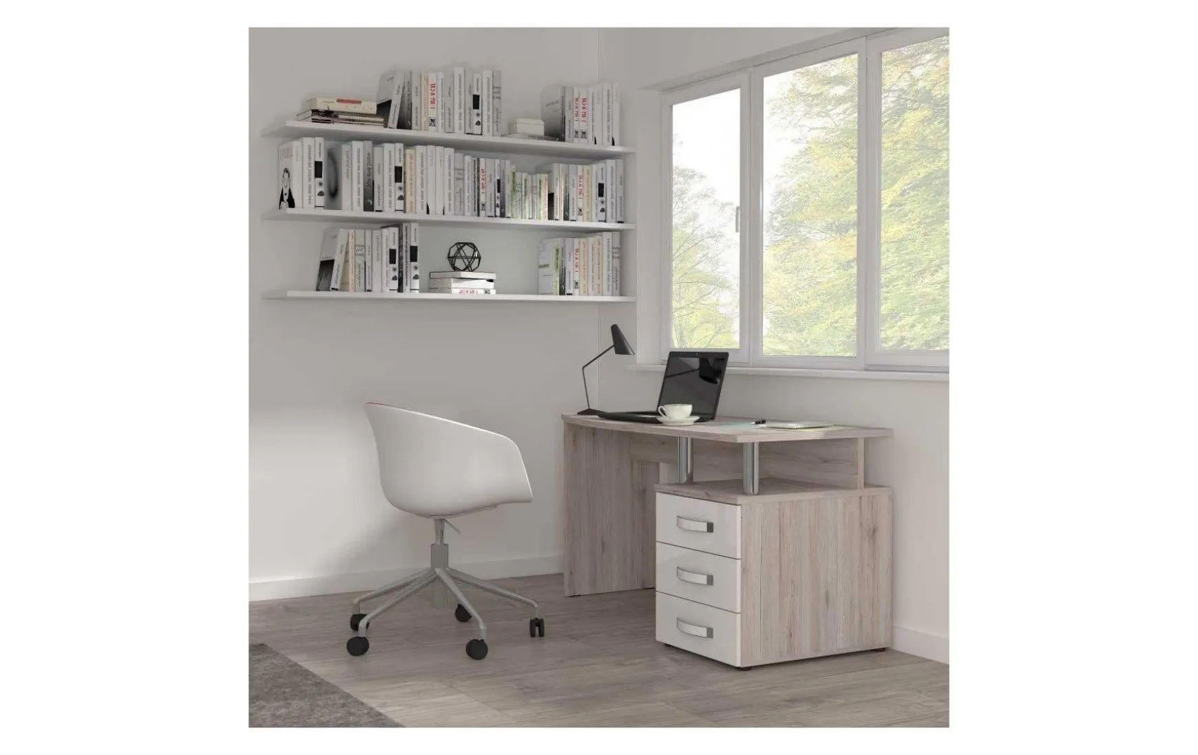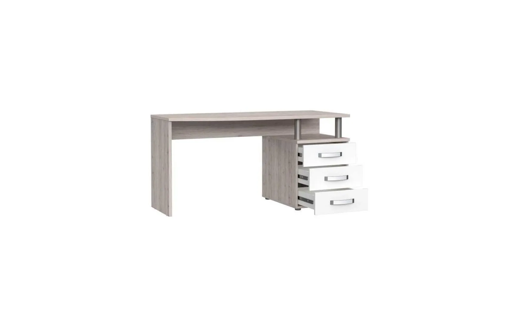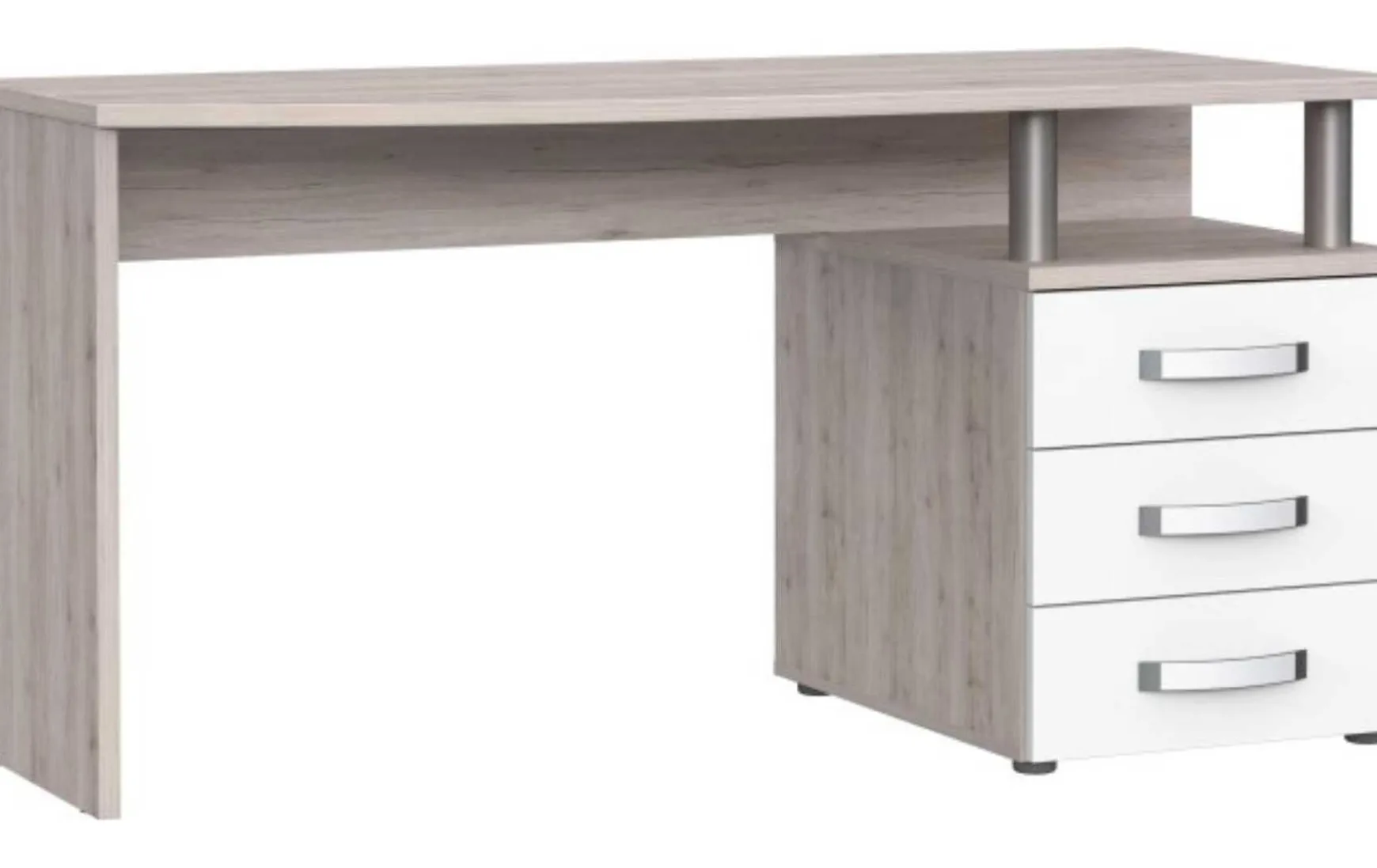 Der moderne Schreibtisch in Sandeiche mit Weiß-Hochglanz-Akzenten eignet sich ideal für kleine Räume und verbindet Funktionalität mit einem zeitgemäßen Design. Die gerundete Tischplatte sorgt für eine angenehme Optik und bietet ausreichend Arbeitsfläche für den Alltag. Im Lieferumfang ist ein praktischer Standcontainer enthalten, der mit drei Schubladen und einem zusätzlichen Fach viel Stauraum für Unterlagen und Büromaterial bietet. Silberfarbene Edelstahlgriffe setzen dezente, moderne Akzente und runden das Gesamtbild harmonisch ab. Gefertigt aus pflegeleichten Holz-Nachbildungen ist der Schreibtisch besonders robust und lässt sich einfach reinigen. Durch seine klaren Formen und die moderne Farbkombination fügt er sich problemlos in verschiedene Wohn- und Arbeitsbereiche ein.