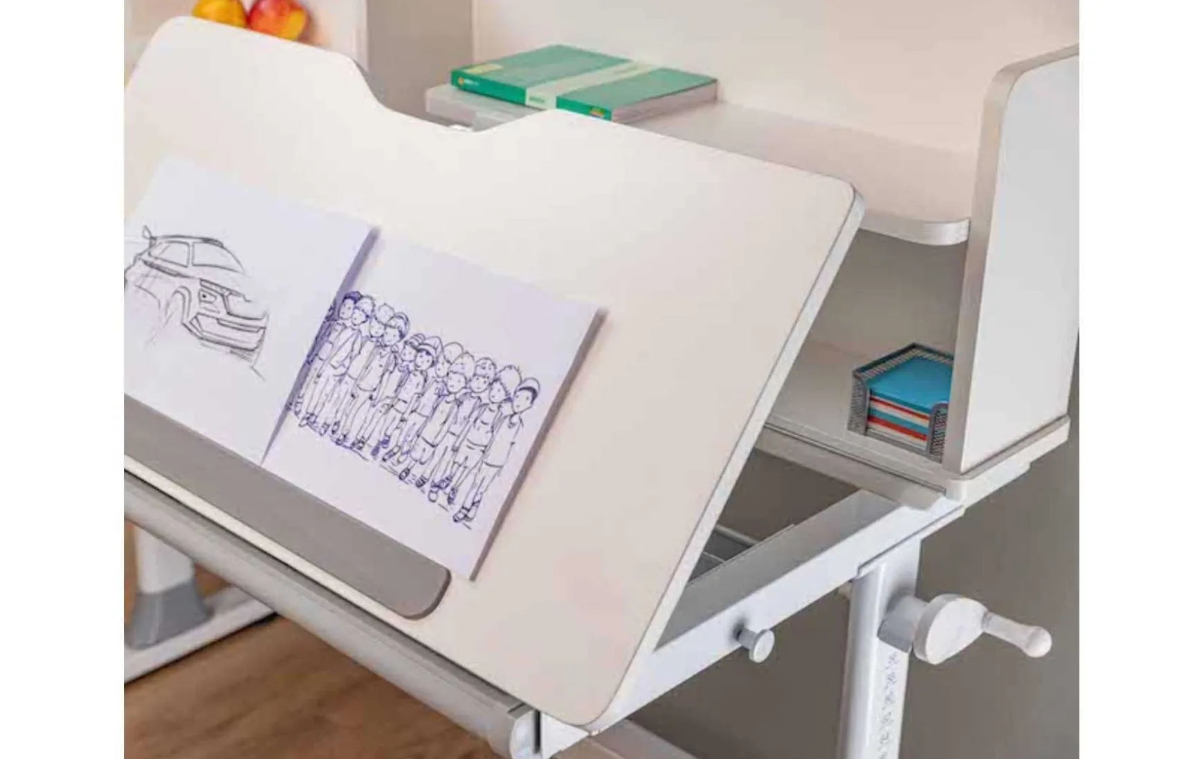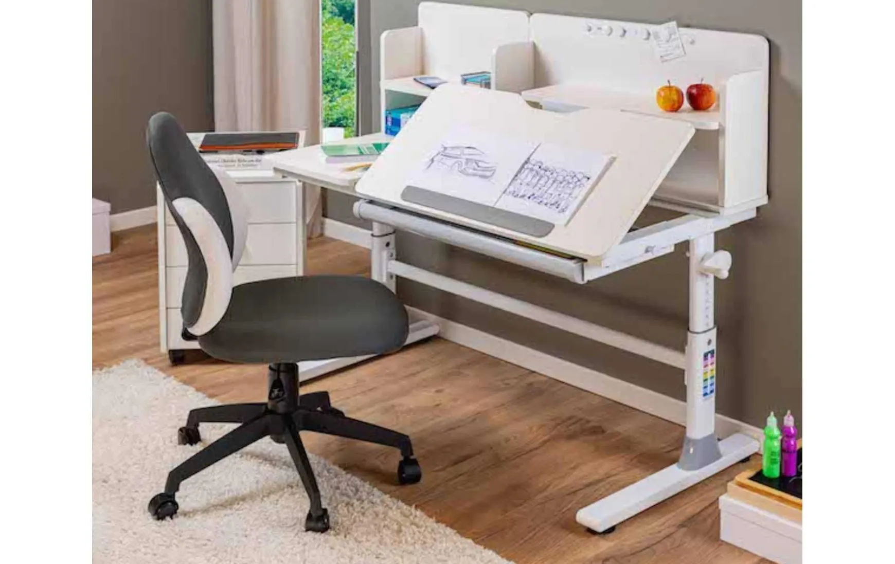 Der Kinder-Mitwachsschreibtisch in Weiß mit grauen Applikationen ist eine durchdachte Lösung für das Kinderzimmer und unterstützt Kinder optimal beim Lernen, Lesen und Spielen. Dank der höhenverstellbaren Konstruktion wächst der Schreibtisch mit und lässt sich im Bereich von ca. 56 bis 76 cm (mit Ablage 96 bis 116 cm) an die Körpergröße des Kindes anpassen. Die geteilte Tischplatte bietet eine Hauptarbeitsfläche mit verstellbarer Neigung, während ein fester Ablagebereich zusätzlichen Platz für Bücher und Schulmaterialien schafft. Eine geräumige Schublade sorgt für Ordnung bei Schreibutensilien und Notizheften. Ergänzt wird der Schreibtisch durch eine Regalerweiterung mit Magnetfläche für Notizen sowie eine ausziehbare Halterung für Tablet oder Buch. Praktische Details wie eine Handgelenkstütze und eine Halterung für die Schultasche runden die funktionale Ausstattung ab und machen den Schreibtisch zu einem idealen Begleiter während der Schulzeit.