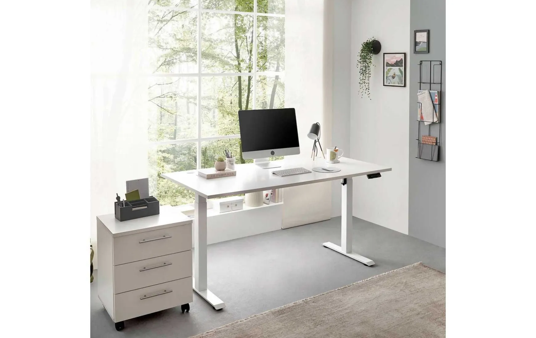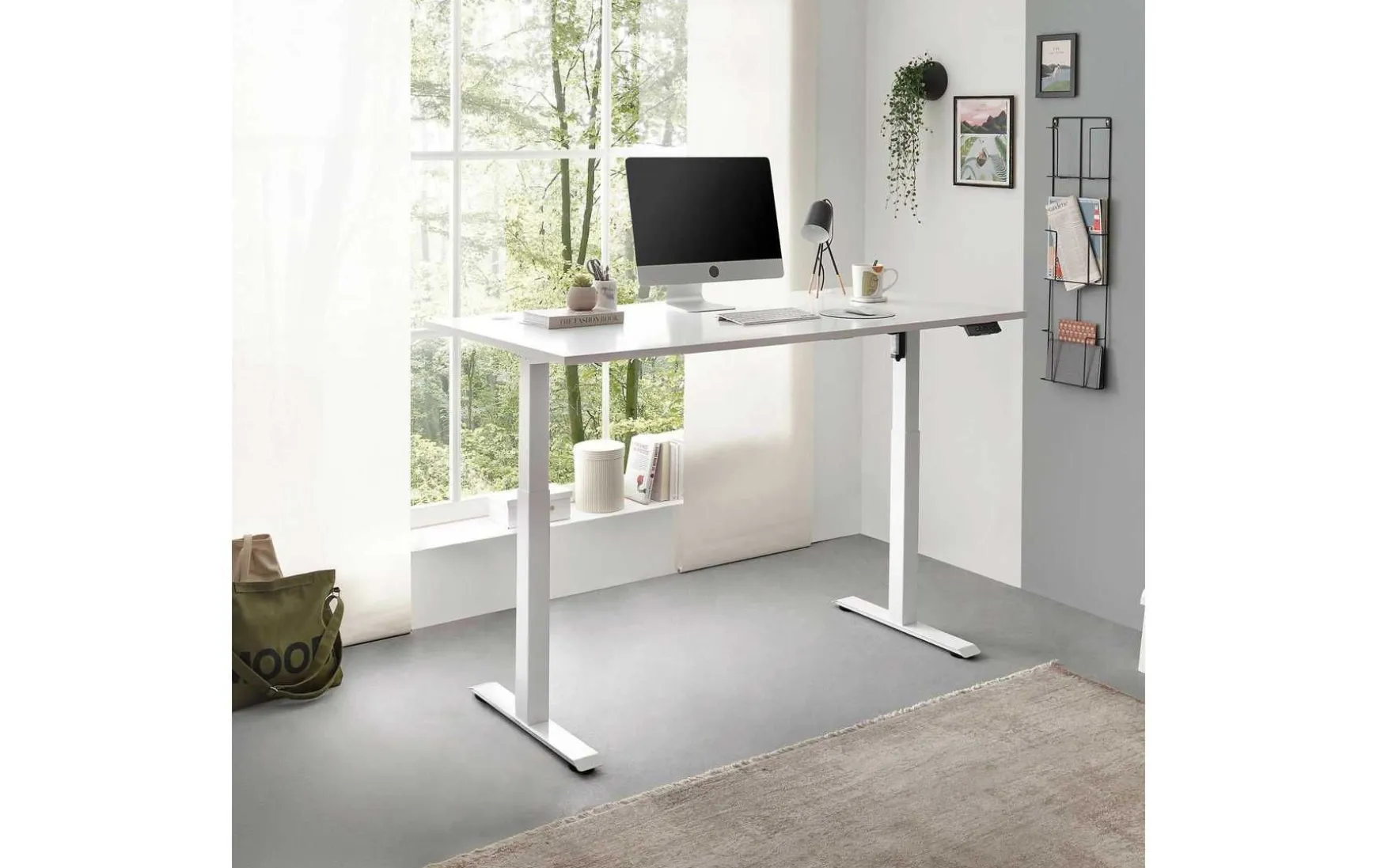 Der elektrisch höhenverstellbare Schreibtisch in Weiß vereint modernes Design mit ergonomischer Funktionalität und ist ideal für Büro oder Homeoffice. Die Tischhöhe lässt sich bequem bis auf ca. 117 cm anpassen, sodass sowohl Arbeiten im Sitzen als auch im Stehen möglich ist. Das massive Metallgestell sorgt für Stabilität, während die Tischplatte aus melaminbeschichteter Spanplatte eine pflegeleichte und robuste Arbeitsfläche bietet. Mit den Maßen von ca. 160 × 77 × 74 cm (B/T/H) bietet der Schreibtisch ausreichend Platz für Computer, Unterlagen und Arbeitszubehör. Die Montage ist leicht durchführbar, und der Schreibtisch wird zerlegt geliefert.