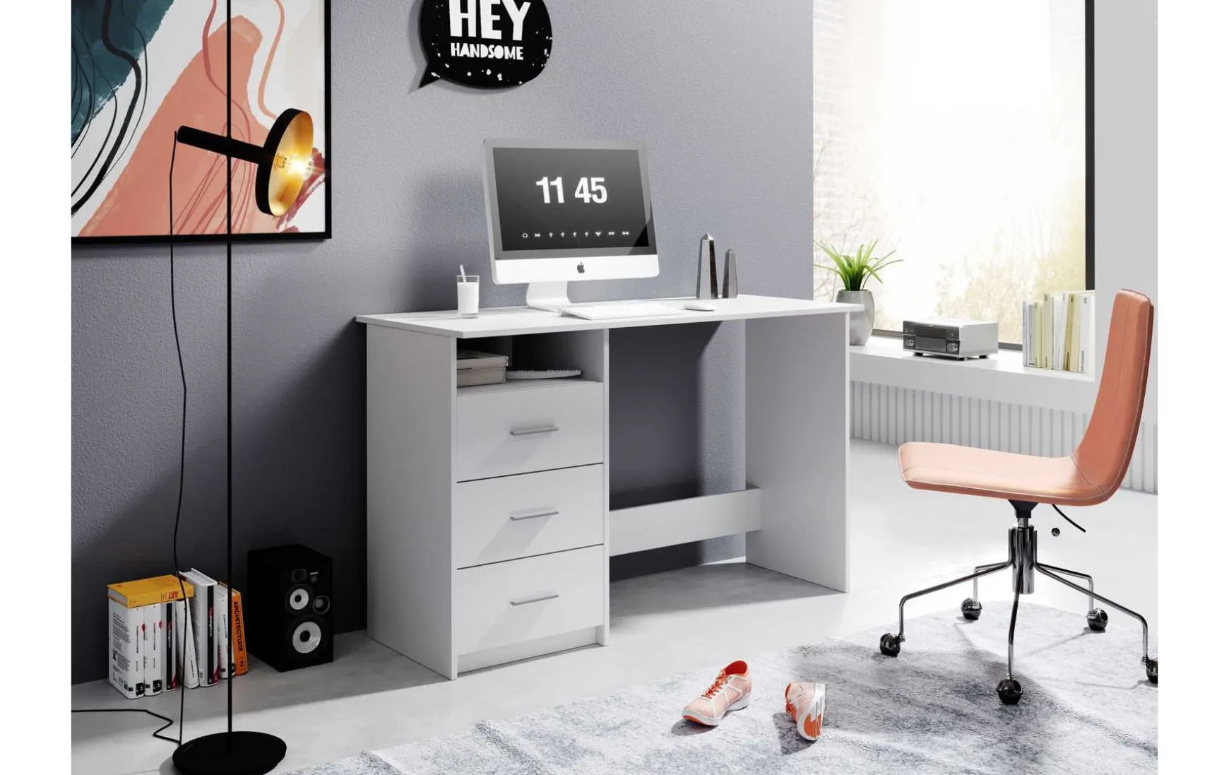 Der rechteckige Schreibtisch ist ideal für ein Jugendzimmer oder Büro geeignet. Er verfügt über drei geräumige Schubladen, die ausreichend Platz für Büromaterialien, Unterlagen und persönliche Gegenstände bieten. Die Griffe der Schubladen sind aus weißem Kunststoff gefertigt und passen perfekt zum modernen Design des Schreibtisches. Die einfache Montage ermöglicht es, den Schreibtisch schnell und unkompliziert aufzubauen, ohne dass spezielles Werkzeug erforderlich ist. Dank seiner stabilen Konstruktion und hochwertigen Materialien ist der Schreibtisch langlebig und robust. Mit seinem schlichten und zeitlosen Design fügt sich der Schreibtisch harmonisch in jedes Jugendzimmer oder Büro ein und bietet eine praktische Arbeitsfläche für Hausaufgaben, Arbeiten am Computer oder kreative Projekte.
