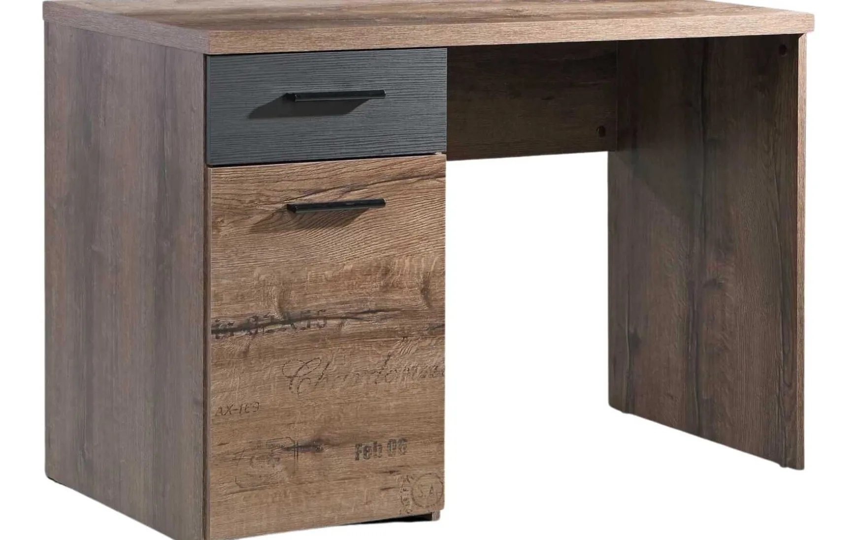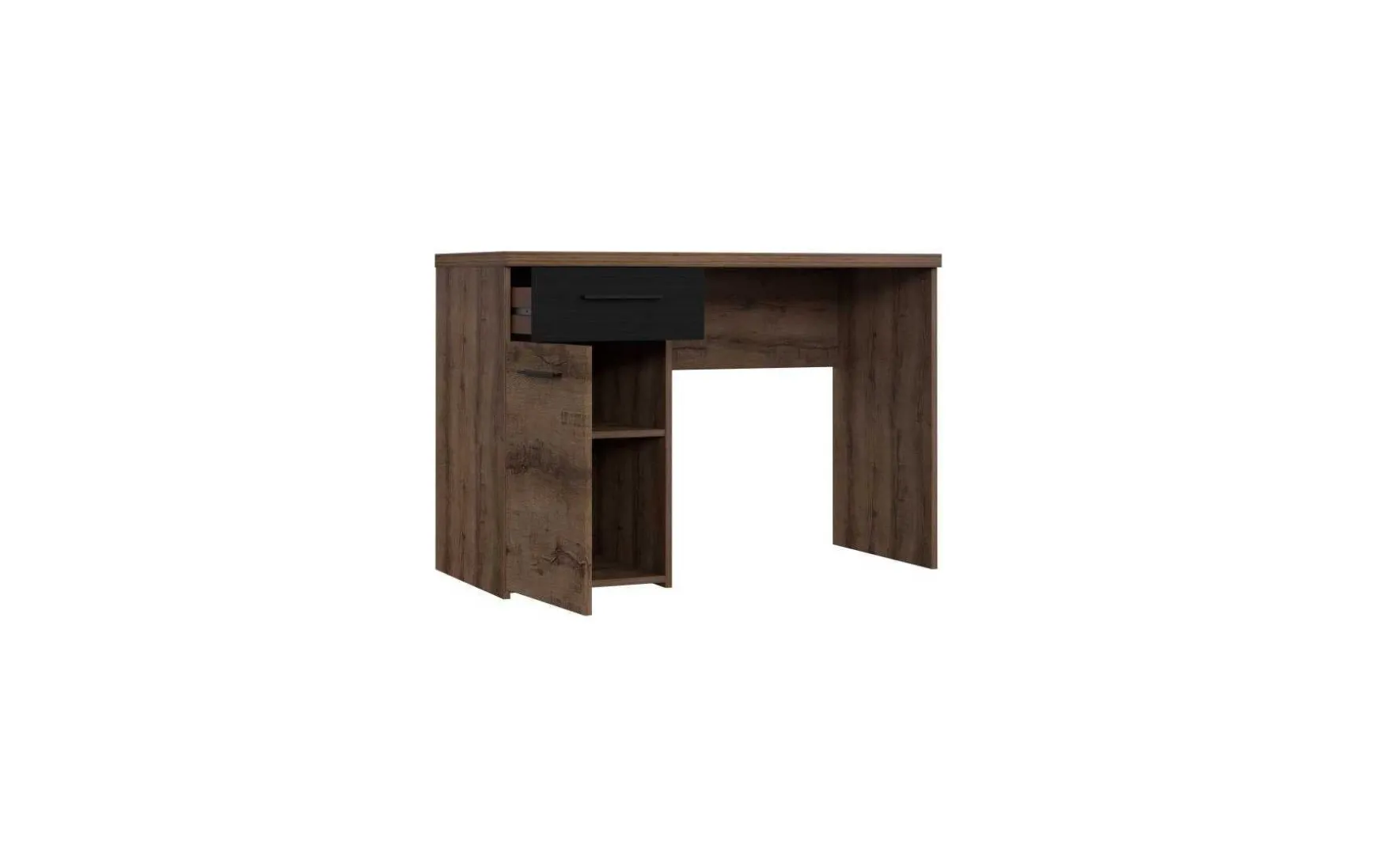Dieser stylische Schreibtisch im modernen Design überzeugt durch seine elegante Kombination aus Schlammeiche-Dekor und Schwarz-Eiche und passt perfekt in Arbeitszimmer, Homeoffice oder Jugendzimmer. Die rechteckige Tischform bietet eine komfortable Arbeitsfläche, während das zeitgemäße Design eine moderne Atmosphäre schafft. Der Schreibtisch verfügt über eine Tür, eine Schublade und zwei offene Fächer, wodurch ausreichend Stauraum für Dokumente, Büromaterial und persönliche Gegenstände entsteht. Die Schublade auf Metalllaufleisten sorgt für ein leichtgängiges Öffnen und Schließen. Gefertigt aus robuster Spanplatte mit melaminharzbeschichteter Oberfläche, ist der Tisch langlebig und pflegeleicht – die Oberfläche lässt sich einfach trocken abwischen. Die Schubladenfront in Schwarz-Eiche aus kontrolliert nachhaltiger Forstwirtschaft setzt dabei einen stilvollen Akzent. Mit seinen Maßen von ca. 110 × 52,7 × 76,5 cm (B/T/H) bietet der Schreibtisch ausreichend Platz zum Arbeiten, ohne zu viel Raum einzunehmen. Der Schreibtisch wird zerlegt geliefert und lässt sich einfach montieren.