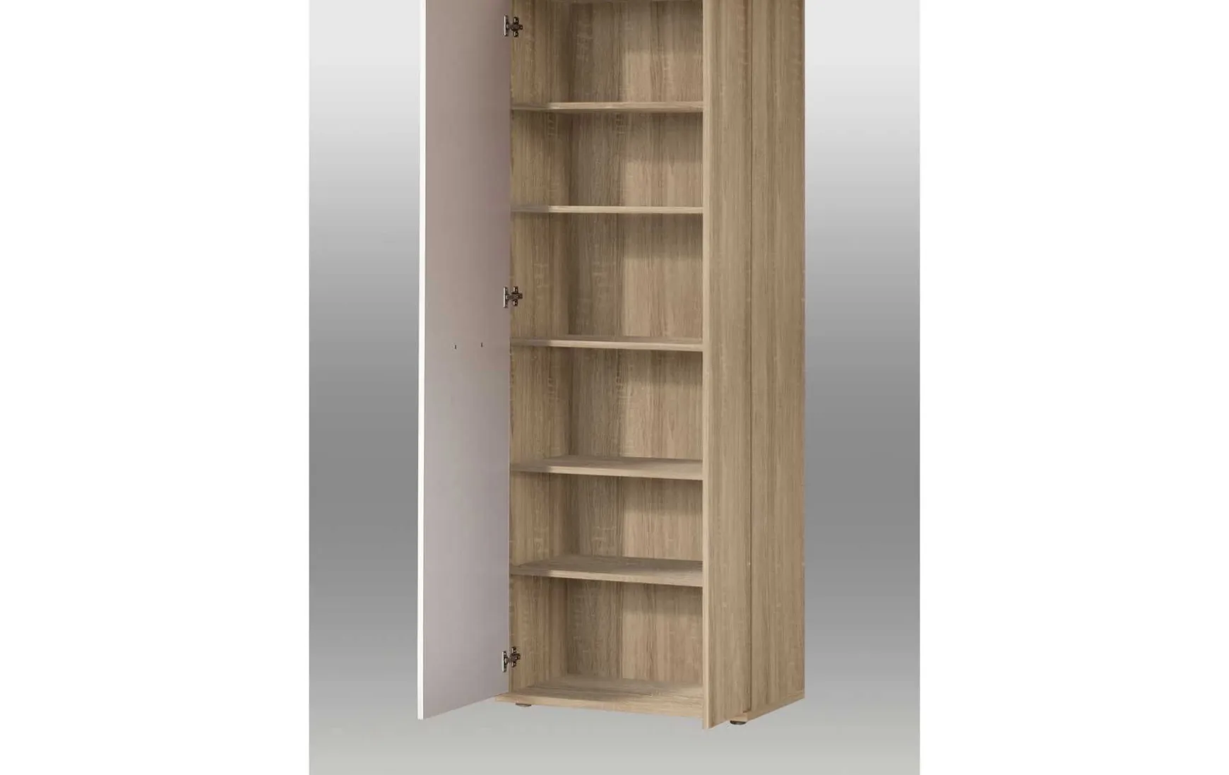 Dieser Schuhschrank im Konsum-Stil vereint modernes Design mit praktischer Funktionalität und sorgt für Ordnung im Flur oder Eingangsbereich. Die Kombination aus Sonoma Eiche Dekor und weißen Fronten verleiht dem Möbelstück eine freundliche und zeitgemäße Optik, während die silberfarbenen Griffe elegante Akzente setzen. Mit fünf Einlegeböden, von denen vier höhenverstellbar sind, bietet der Schuhschrank flexible Aufbewahrungsmöglichkeiten für verschiedene Schuhgrößen und sorgt für eine übersichtliche Ordnung. Die zwei Türen in unterschiedlichen Größen ermöglichen eine einfache Handhabung und optimalen Zugriff auf Ihre Schuhe. Gefertigt aus robuster MDF-Platte ist der Schrank stabil, langlebig und pflegeleicht – die Oberfläche lässt sich einfach trocken abwischen. Mit den Maßen von ca. 68,9 × 34,8 × 179 cm (B/T/H) ist der Schuhschrank kompakt, bietet aber gleichzeitig großzügigen Stauraum. Der Schrank wird zerlegt geliefert und die Dekoration ist nicht im Preis enthalten.