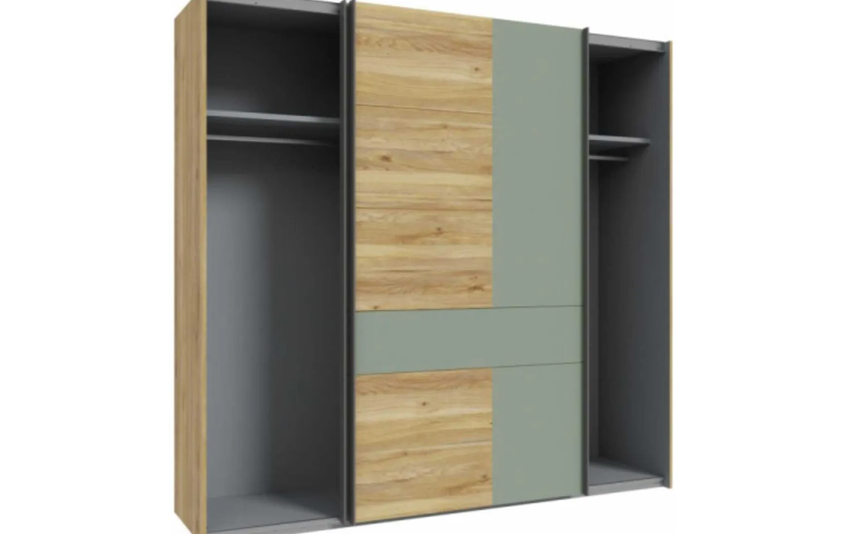 Moderner Kleiderschrank aus einem umfangreichen, grossen Typenprogramm in ganz neuer Farbe Mauvella Eiche abgesetzt mit dezentem Grün. Moderner, skandinavischer Look mit je Abteil 1 Einlegeboden und 1 Kleiderstange Metallbeschläge und kugelgelagerte Metall Laufschienen bei den Türen sorgen für Funktionalität. Ergänzend gibts zu unserem Programm die passenden Betten, weitere Kleiderschränke, Nachtkommoden und Kommoden.