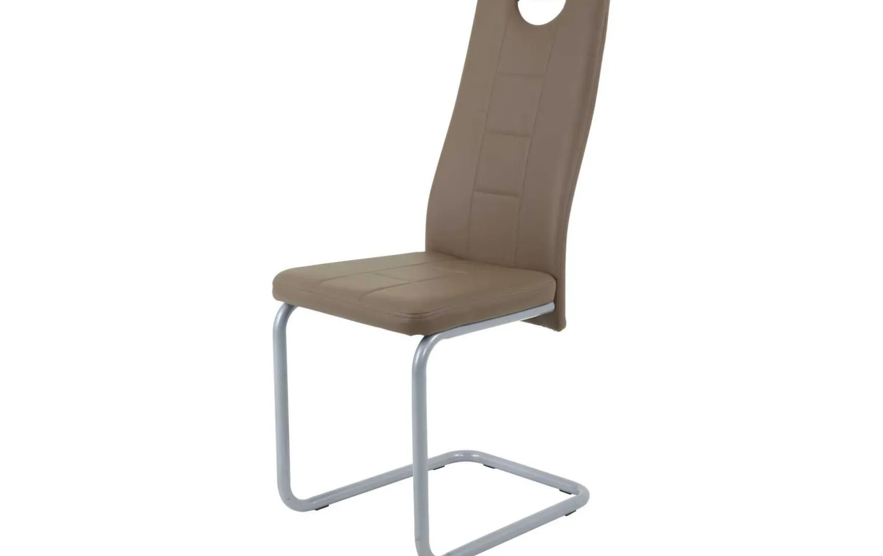 Dieser Moderne Polsterstuhl in einem Lederoptik Stoffbezug in der Farbe Latte, bezaubert mit seinem elegantem Rücken und dem Griffloch, welches erlaubt ihn ganz einfach und bequem zu verstellen wie man ihn braucht. Das Gestell, welches aus Aluminium farbenen Rundrohr besteht, zeugt von Stabilität. Die maximale Belastbarkeit liegt bei ca 120 kg.