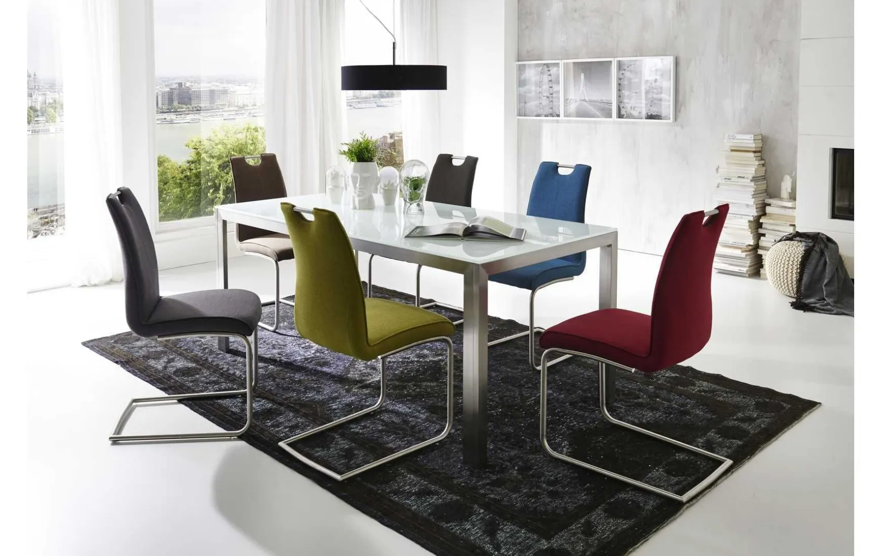 - Anmerkungen: Schwingstuhl ohne Armlehne mit Edelstahlgriff in der Rückenlehne, Gestell Rundrohr Edelstahl gebürstet, Sitzpolsterung mit Wellenfederung, Webstoff-Bezug Messina Anthrazit, 240 Material Bezug, 100% Polyester, Belastbarkeit bis maximal 140 kg
