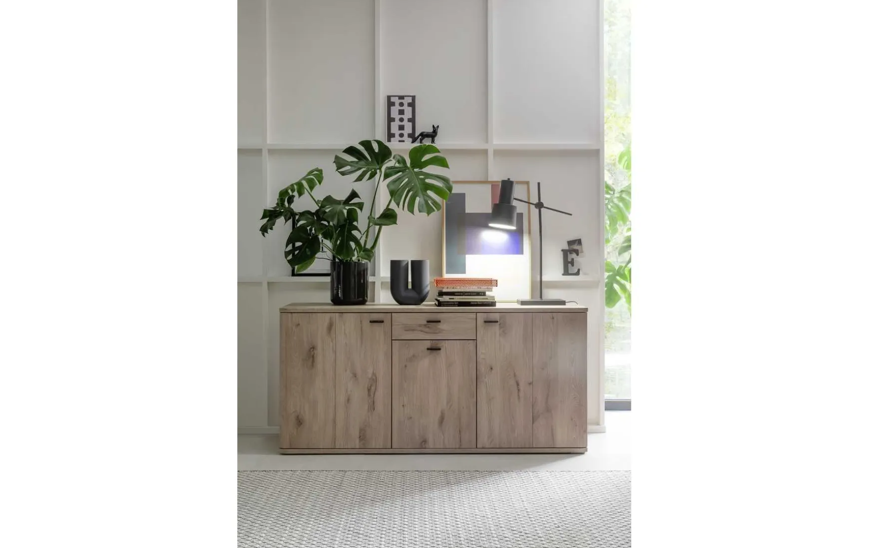 Dieses Sideboard in Viking Oak Nachbildung überzeugt durch seine warme Holzoptik und ein zeitloses Design im Konsum-Stil. Mit drei Türen und einer Schublade bietet es großzügigen Stauraum für Geschirr, Wohnaccessoires oder Alltagsgegenstände. Die gedämpften Türen sorgen für komfortables und leises Schließen, während die schwarzgrauen Metallgriffe einen modernen Akzent setzen.